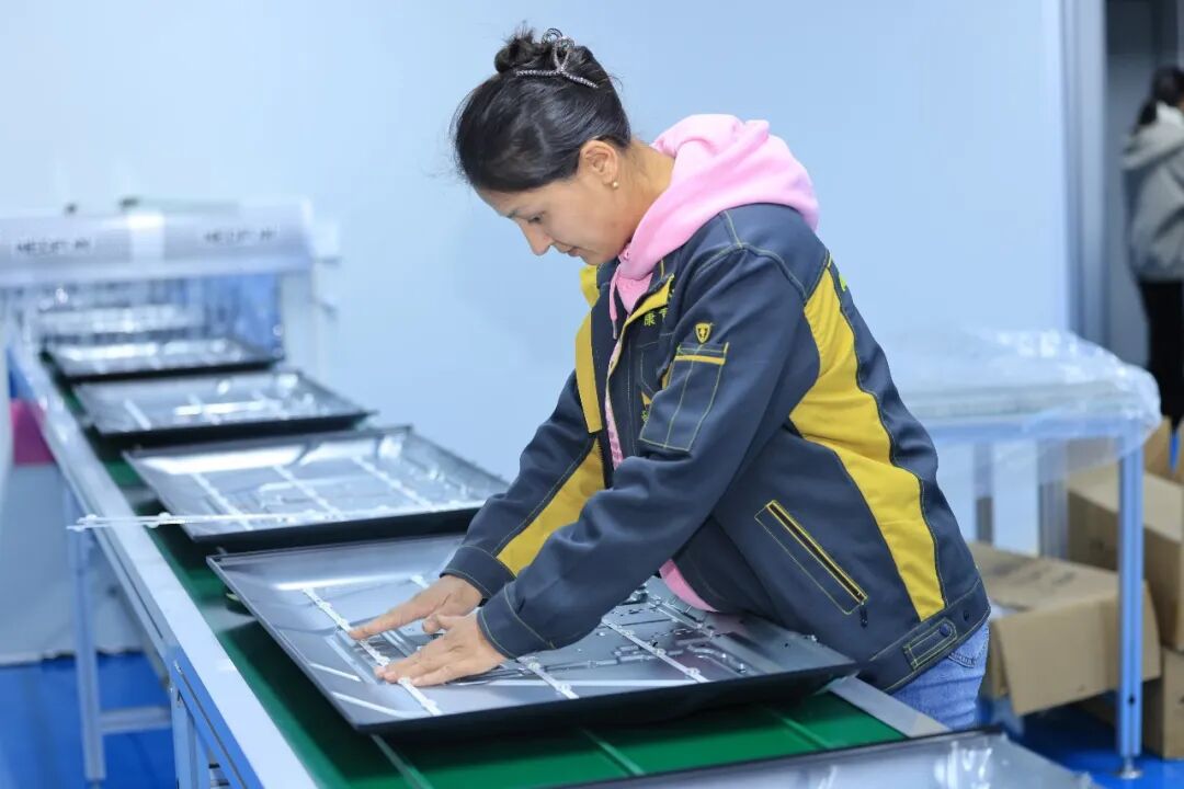 在中国(新疆)自由贸易试验区喀什片区某企业内,工作人员正在组装电视机。喀什地区融媒体中心 记者陈文军 摄