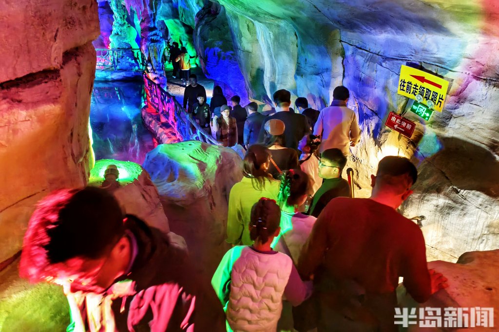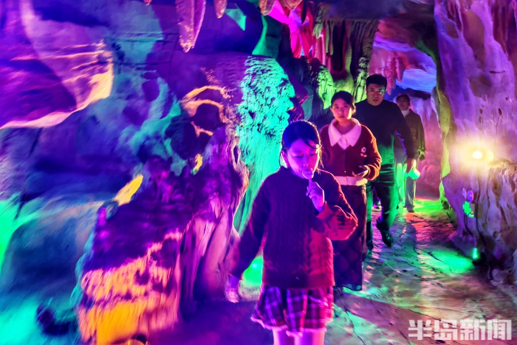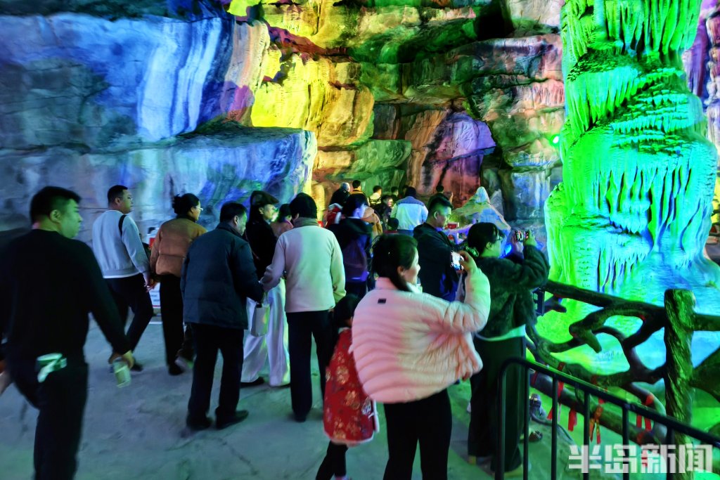 2026年新春佳节期间,各地景区迎来客流高峰。2月20日,潍坊市一处溶洞,钟乳林立、石幔垂悬,在七彩灯光的映照下恍若仙境。洞中游客络绎不绝、人气爆棚,人们沿着蜿蜒的步道缓缓前行,时而仰头惊叹,时而俯身端详。景区内各处装扮年味十足,与地下亿万年的造化,在这个春节完美交织。(半岛全媒体记者吴璟)