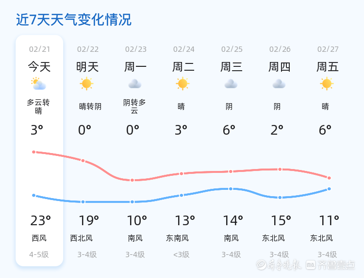 今天是2月21日,农历正月初五,星期六。德州市迎来晴好天气,白天气温逐步回升,预计最高气温可达23℃,最低气温为3℃。目前,全市天气为多云转晴,南风2级,空气湿度70%,PM2.5指数为68,空气质量良好。各区天气情况基本一致,市民可以放心外出活动。明天天气将由晴转阴,气温较今日有所下降,最高气温为19℃,最低气温为0℃,风力有所增强,为西北风3-4级。与今日相比,明天天气转阴,气温下降,市民需注意保暖。未来三天,德州市天气将呈现波动趋势。预计明后两天,天气以阴或多云为主,气温较低,最低气温为0℃,最高气温在10℃左右。周四开始,天气逐渐转晴,气温有所回升。市民需注意及时增减衣物,防范感冒等疾病。温馨提示
