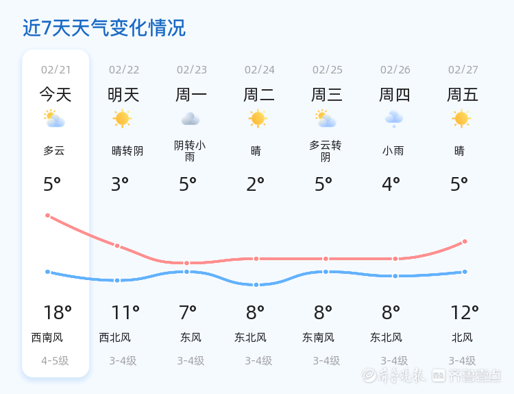 今天是2月21日,农历正月初五,星期六。日照市今天天气以多云为主,气温在5℃至18℃之间波动。目前,市区温度为9.8℃,西风3级,空气湿度66%,PM2.5指数为55,空气质量良好。各区天气情况总体平稳,以多云为主,部分地区可能出现零星云层变化。 明天,日照市天气将由晴转阴,气温有所下降,预计在3℃至11℃之间。与今天相比,明天气温下降较为明显,风力将维持在3-4级,市民需注意保暖。 预计未来三天,日照市天气趋势多变。周一将出现阴转小雨天气,气温在5℃至7℃之间;周二至周三天气以晴或多云为主,气温逐步回升,周四将迎来小雨天气,气温在4℃至8℃之间。市民需根据天气变化及时调整着装,尤其是阴雨天气,道路可能湿滑,出行请注意安全。 温馨提示