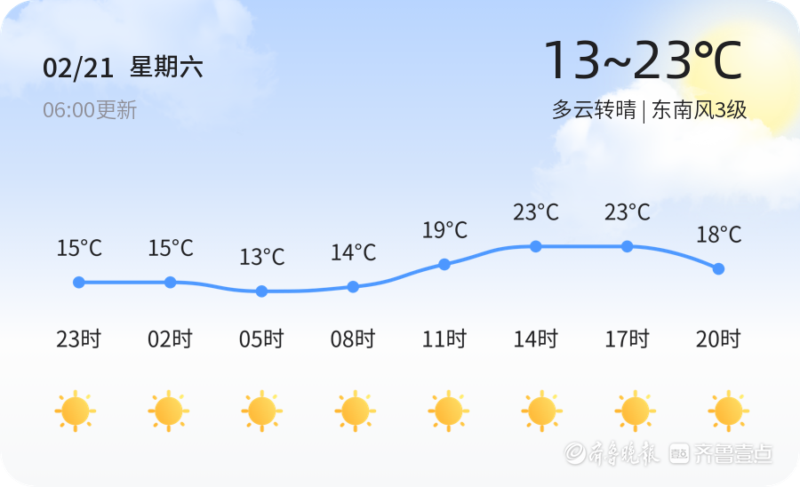 今天是2月21日,正月初五,星期六。济南迎来多云转晴的好天气,气温适中,白天最高气温23℃,夜间最低气温13℃。东南风3级,空气湿度49%,pm2.5指数为58,空气质量状况为良。今日天气适宜外出活动,但市民需注意防范大风天气带来的影响,建议外出时远离广告牌等高空悬挂物,行车时保持车距,减速慢行。同时,大风可能导致扬尘,敏感人群应注意防护。