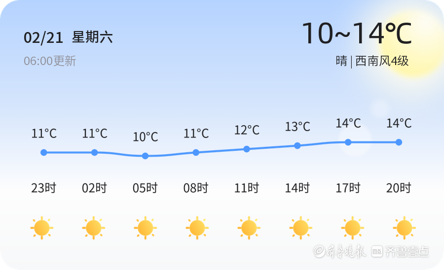 今天是2月21日,正月初五,青岛市迎来晴朗天气。气温方面,今天白天最高气温14℃,最低气温10℃,目前温度为9.2℃。风向为西南风4级,空气湿度为73%,PM2.5浓度为65,空气质量为良好。市民朋友们可以放心外出,但建议随身携带外套,以应对早晚温差。由于风力较大,外出时请注意远离广告牌和大树,确保安全。