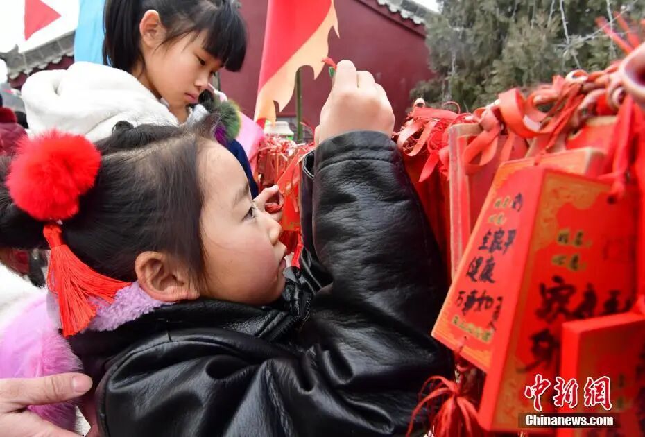 图为一小朋友系上财神祈福卡。 翟羽佳 摄