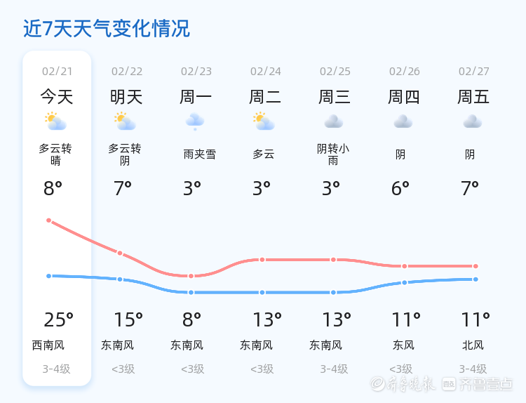 今日是2026年2月21日,星期六,农历正月初五。菏泽市今日天气为多云转晴,气温介于8℃至25℃之间,西南风3级,空气湿度67%,PM2.5指数63。各区天气情况基本一致,均为多云转晴,气温平稳,风力适中,整体天气较为适宜出行。nn明日,即2月22日,菏泽市天气将转为多云转阴,气温较今日有所下降,最低气温7℃,最高气温15℃。与今日相比,明日的气温变化较为明显,市民需注意保暖,尤其是早晚温差较大,建议适时增减衣物。nn未来三天,菏泽市天气趋势为2月23日有雨夹雪,气温3℃至8℃;2月24日多云,气温3℃至13℃;2月25日阴转小雨,气温3℃至13℃。由于2月23日有雨夹雪天气,道路可能湿滑,市民出行需格外注意交通安全,尤其是驾驶车辆时应减速慢行,保持安全车距。nn温馨提示