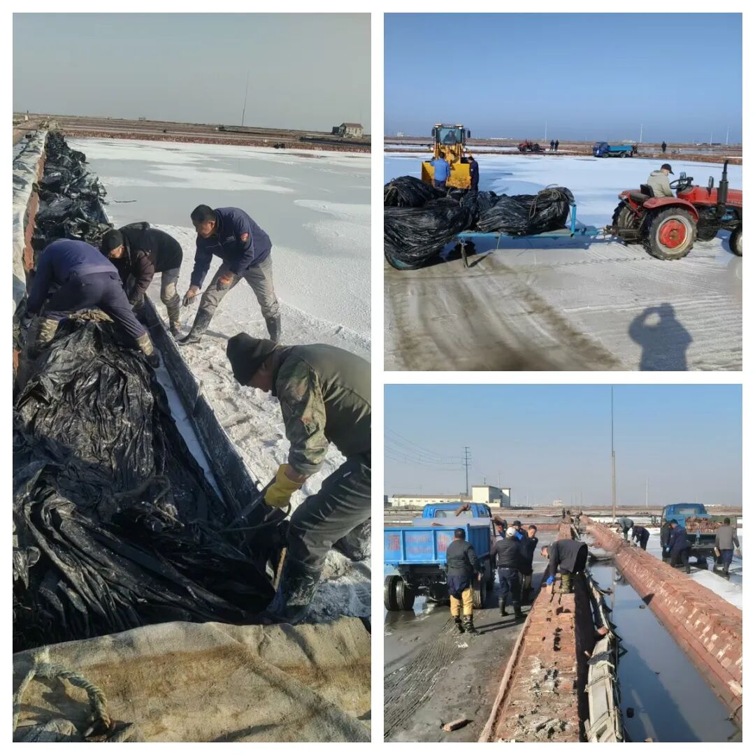 羊口盐场组织制盐五场干部员工坚守生产一线,有序开展撤塑料、清砖等作业任务。