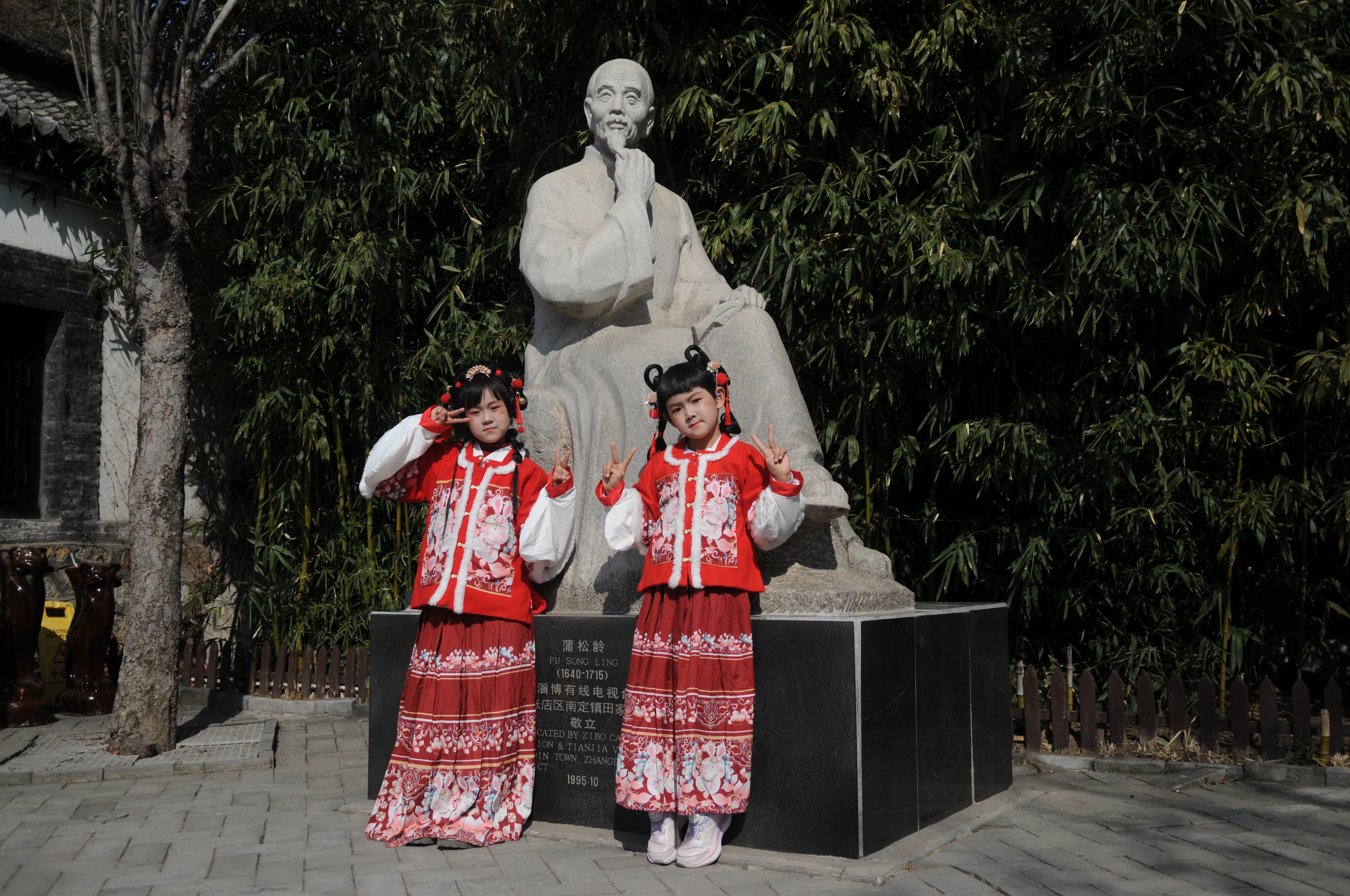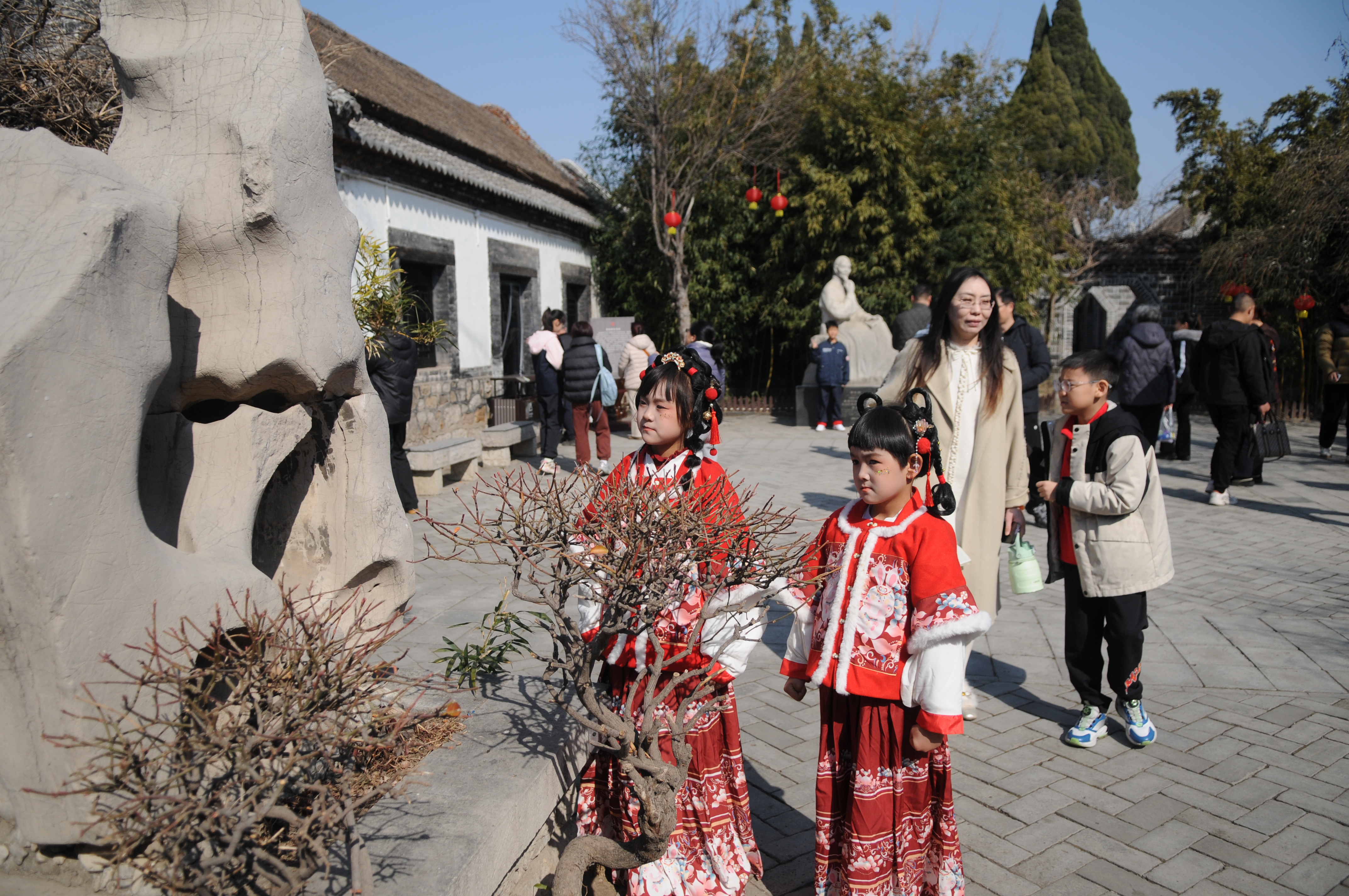 2月19日,来自烟台的两名小朋友张凌菲、姜月正在山东省淄博市淄川区蒲松龄故居游玩。春节期间,全国重点文物保护单位、国家一级博物馆蒲松龄故居免费向社会开放,吸引了来自全国各地的游客前来参观、休闲、游玩。张凌菲、姜月是表姊妹,正在上小学和幼儿园,他们在家人的陪伴下,身着节日盛装,变身“小天使”,成为游客中的另外一道风景。