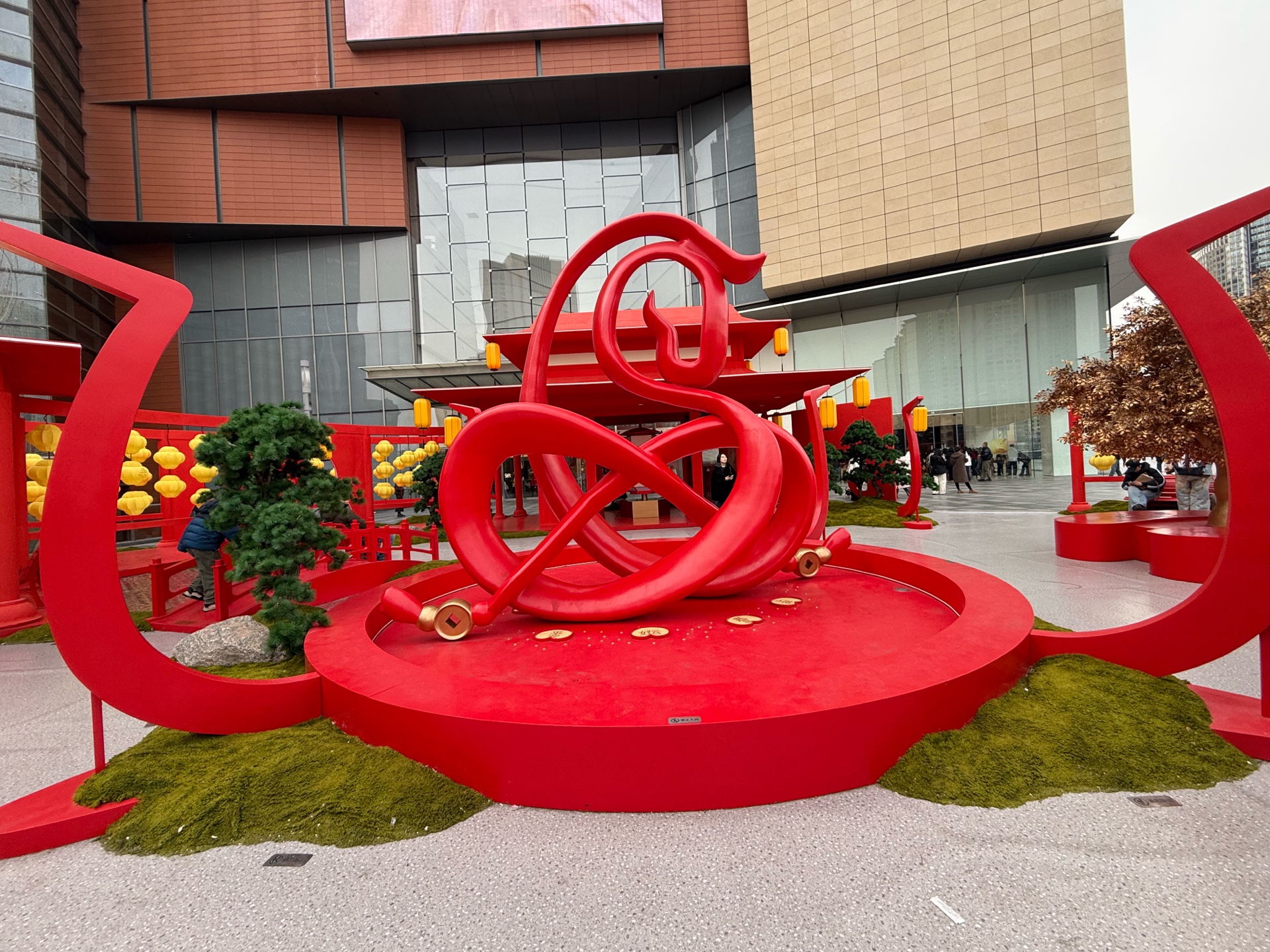 走进万象城1号门,一幅红红火火的中式画卷在眼前铺陈开来,主体装置以中国传统建筑中的“藻井”结构为灵感,层层叠叠的中国红与鎏金色彩交织,悬挂着象征吉祥如意的灯笼与流苏。最引人注目的是一组昂首向前的骏马艺术造型,姿态矫健,鬃毛飘逸,寓意“马到成功”。