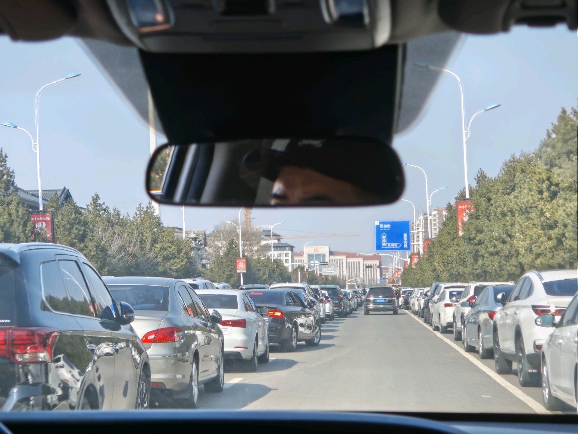 2月18日,琅琊古城景区外的车辆排起长队,该图为出警途中的车内视角。张彦芳告诉记者,目测车辆排队长度约在2个红绿灯左右。(陈瑞阳 摄)
