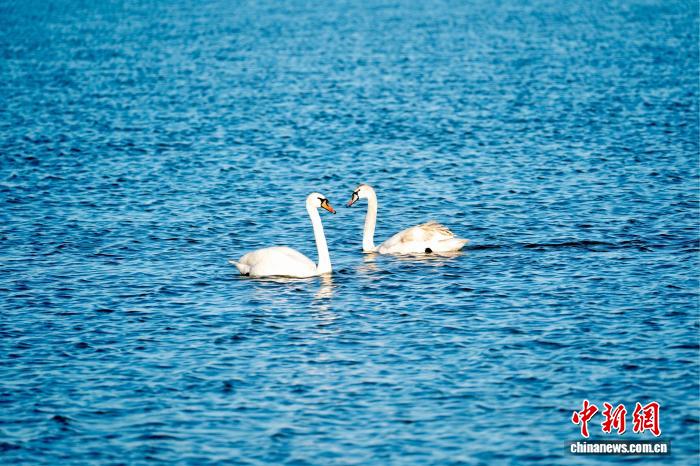 2月18日,在东营黄河口生态旅游区,两只疣鼻天鹅在湿地水域中相伴游弋。任明杰 摄