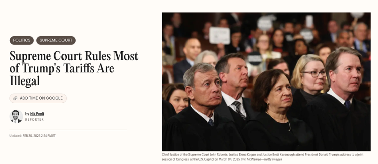 △《时代》报道,最高法院裁定特朗普的大部分关税政策违法,这对其经济议程的核心造成沉重打击