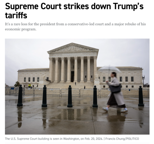 △美国媒体《政治》报道,最高法院驳回特朗普的全面关税政策,这是对其经济计划核心内容的重大否定