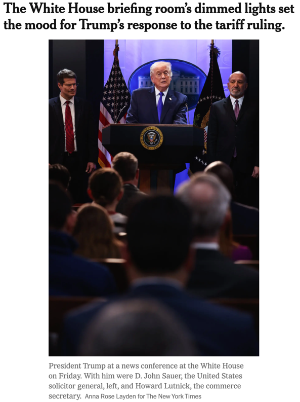 △《纽约时报》报道,最高法院推翻特朗普全面关税政策后,白宫在特朗普的新闻发布上调暗了灯光