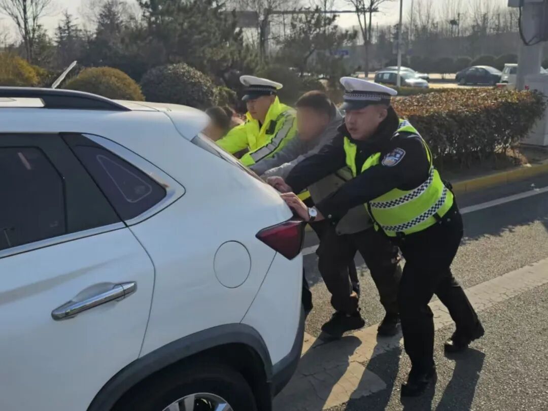 2月18日9时10分,交管八中队民警巡逻至安和路时,发现前方路口一辆白色SUV 在信号灯由红变绿后迟迟未启动,后方车辆已开始出现拥堵迹象。民警立即靠边停车上前查看,经询问得知,该车行驶至路口时突发故障,发动机无法启动,导致车辆停滞在行车道上。