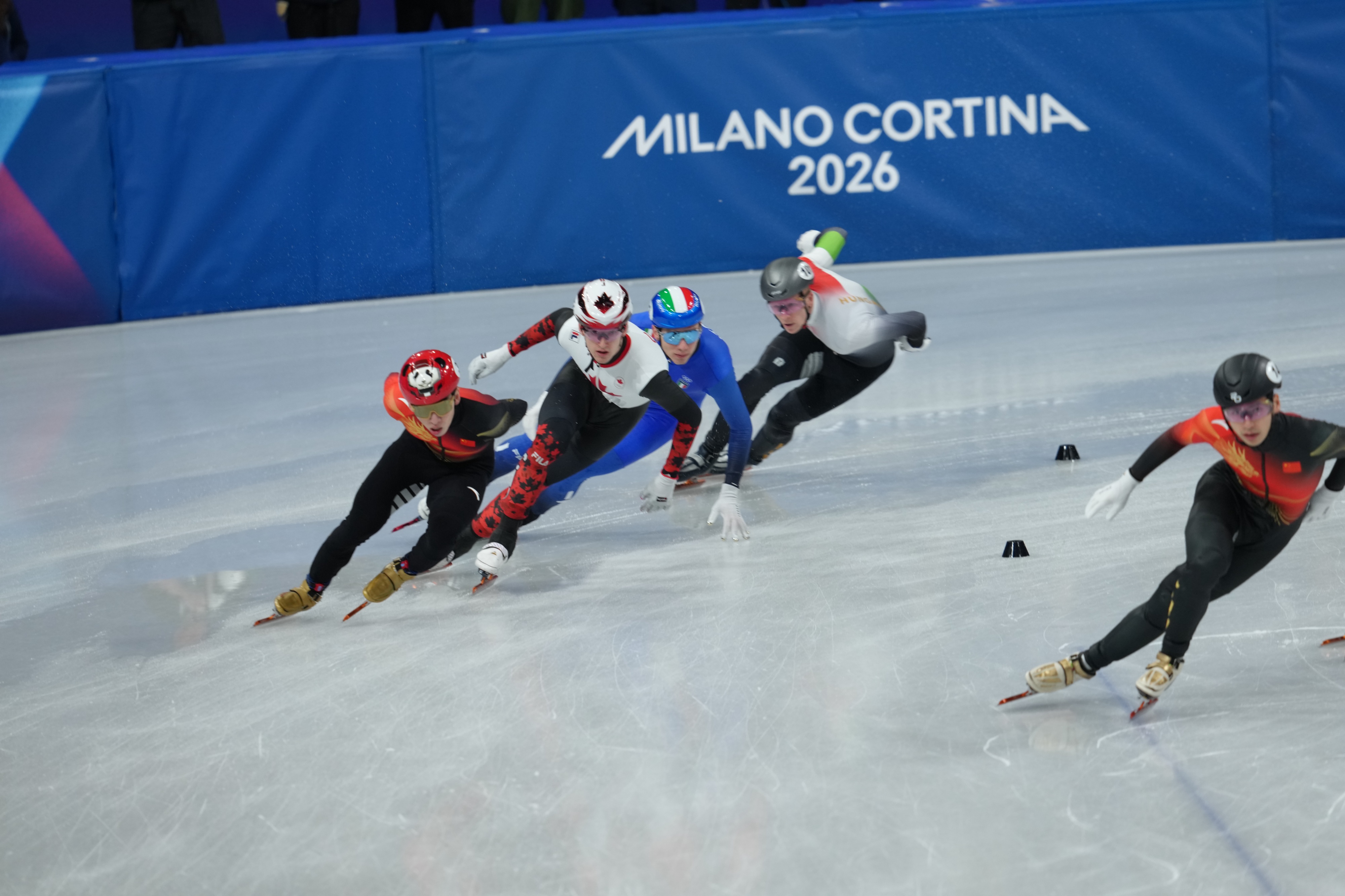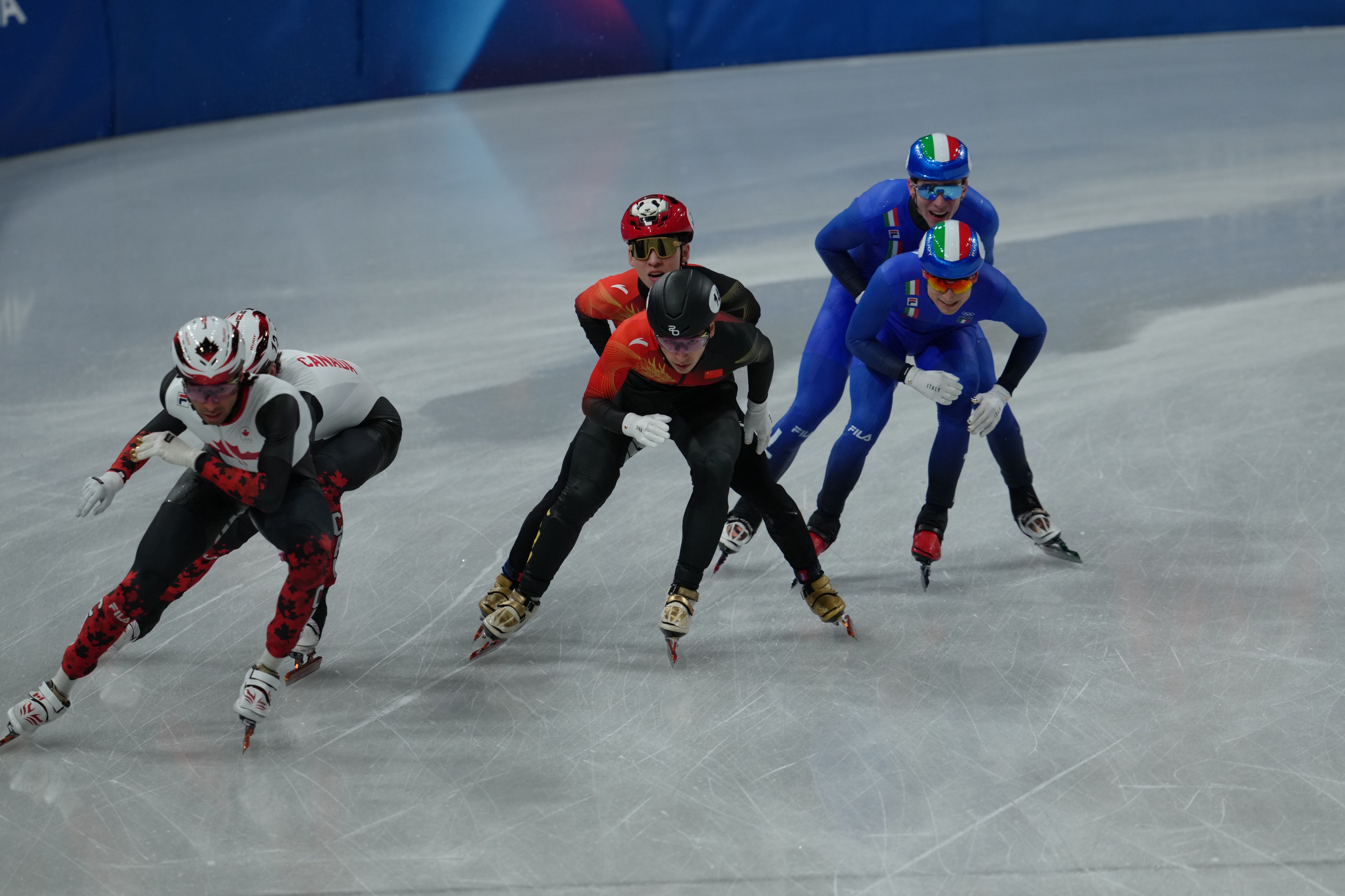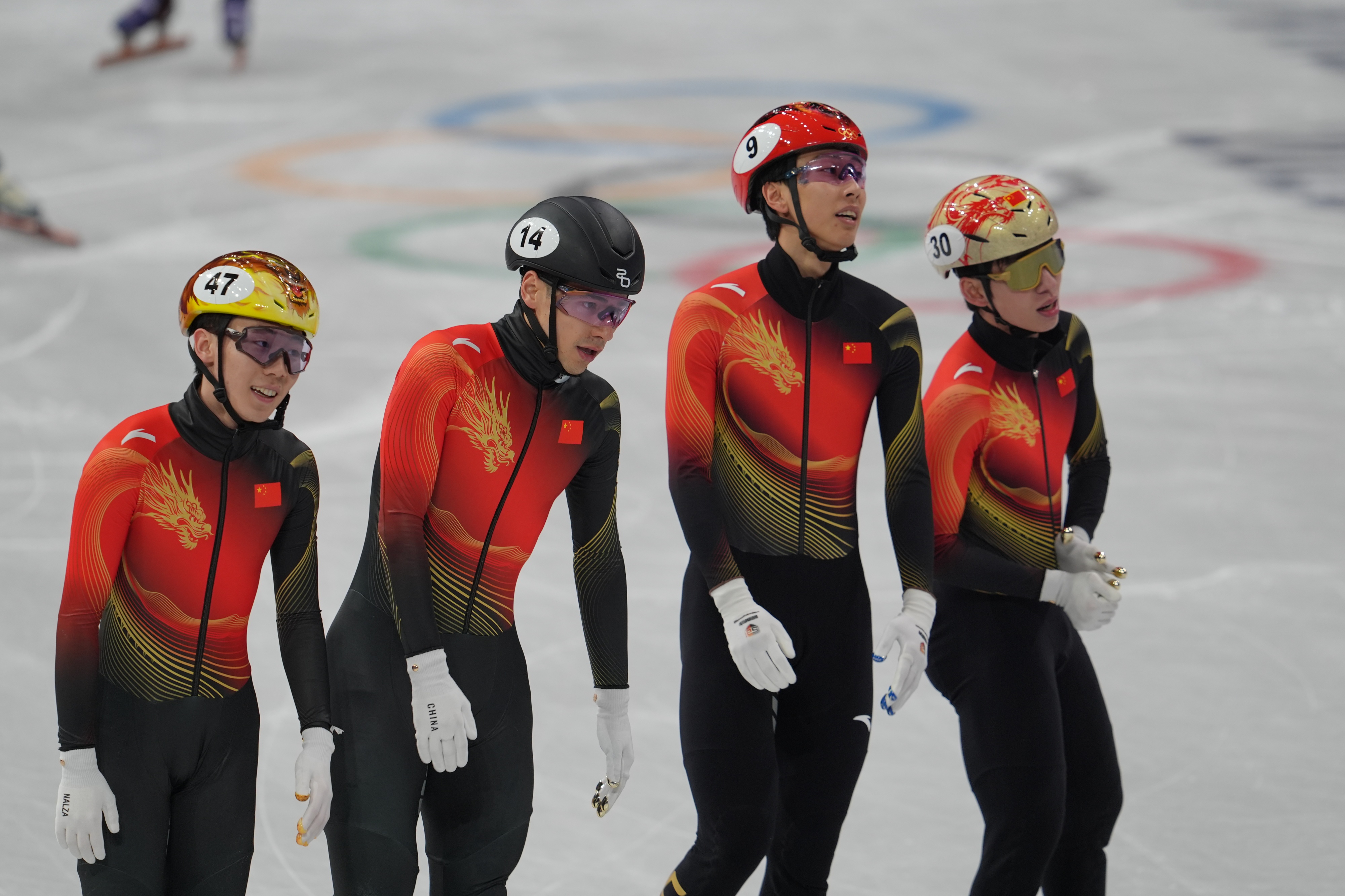 米兰时间2月20日晚,在短道速滑男子5000米B组接力中,中国队用一场酣畅淋漓的胜利,赢得小组第一。图为比赛中接力的瞬间。图为比赛结束,中国队四位队员携手同行、意犹未尽。(大众新闻米兰冬奥特派记者于晓波)