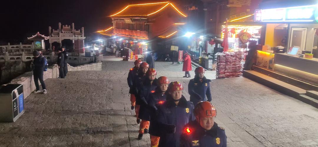夜色笼罩天街,红灯笼微明。指战员们裹紧深蓝色防寒服,头盔上的警示灯在青石板路上投下晃动的光晕。沿着陡峭山路,他们逐一查验沿途消防设施,摸黑排查林间与建筑死角的火灾隐患。