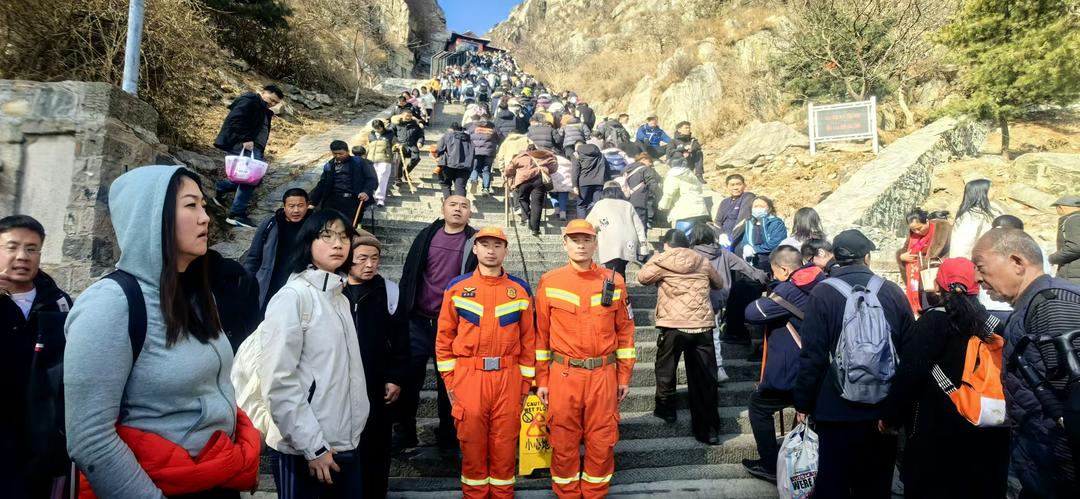正月里的泰山,迎来了春运客流高峰。十八盘陡峭的石阶上,登山队伍首尾相接。在涌动的人潮中,几抹亮眼的橙色定格在道路两侧——济南消防救援机动支队泰安靠前驻防分队的指战员们,正逢山驻守。