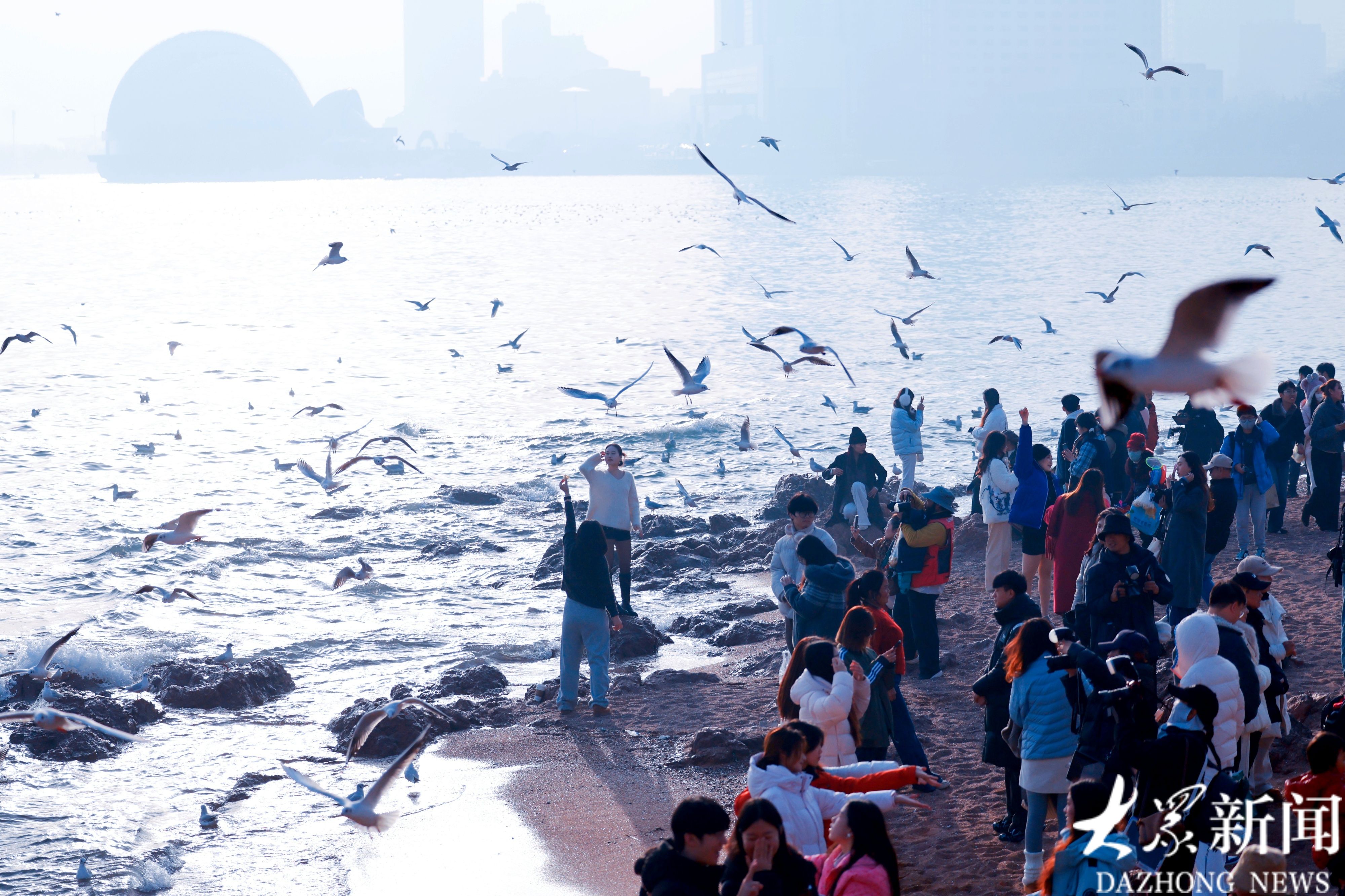 2月21日,人们在青岛栈桥景区游览,或投喂海鸥,或与海鸥拍照互动,一派“人鸥同乐”的热闹景象。