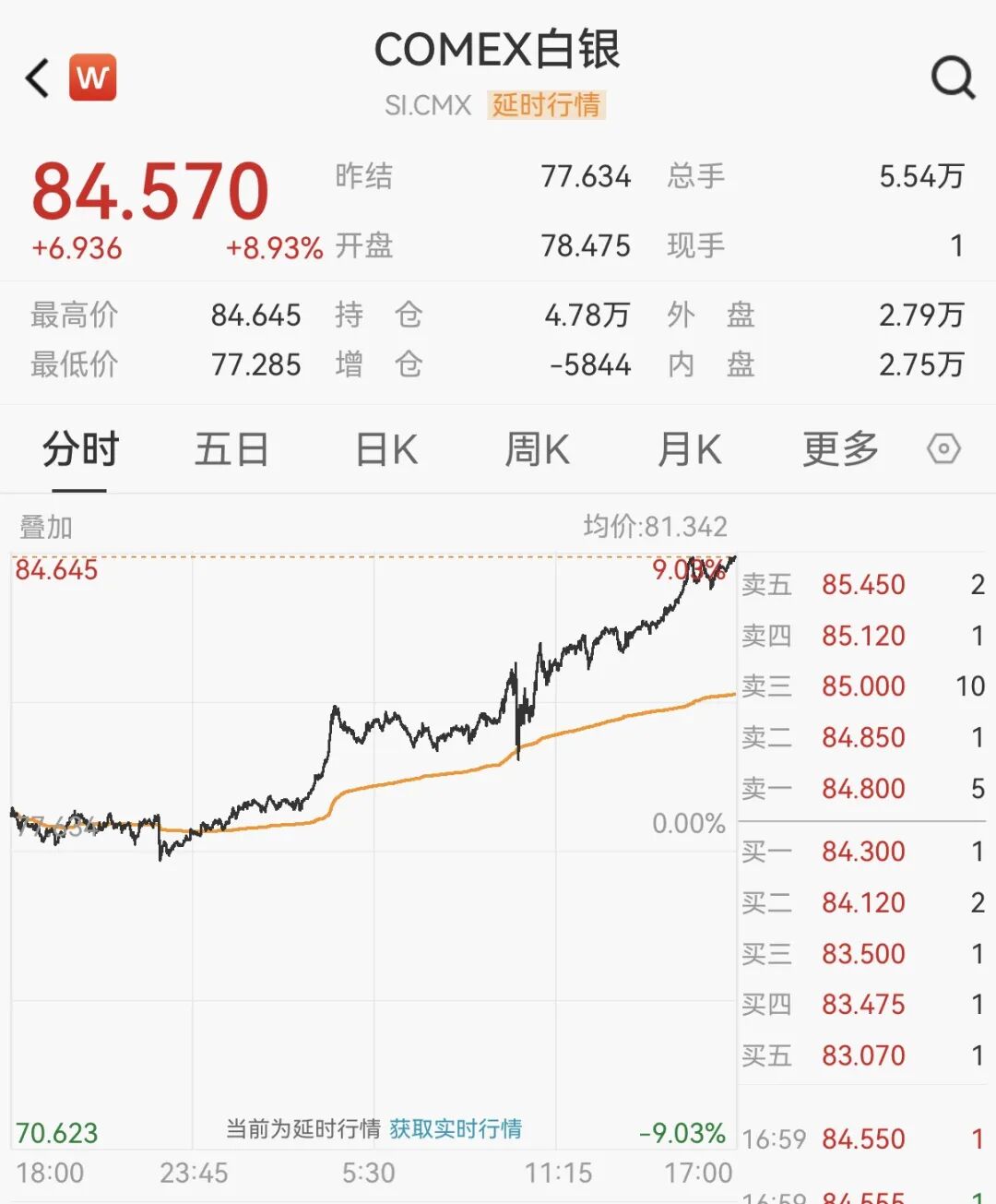 黄金日内涨超2%,重回5100美元。白银美股盘中一度大涨8%。截至发稿,COMEX黄金期货报5130美元;COMEX白银期货报84.57美元,涨8.93%。
