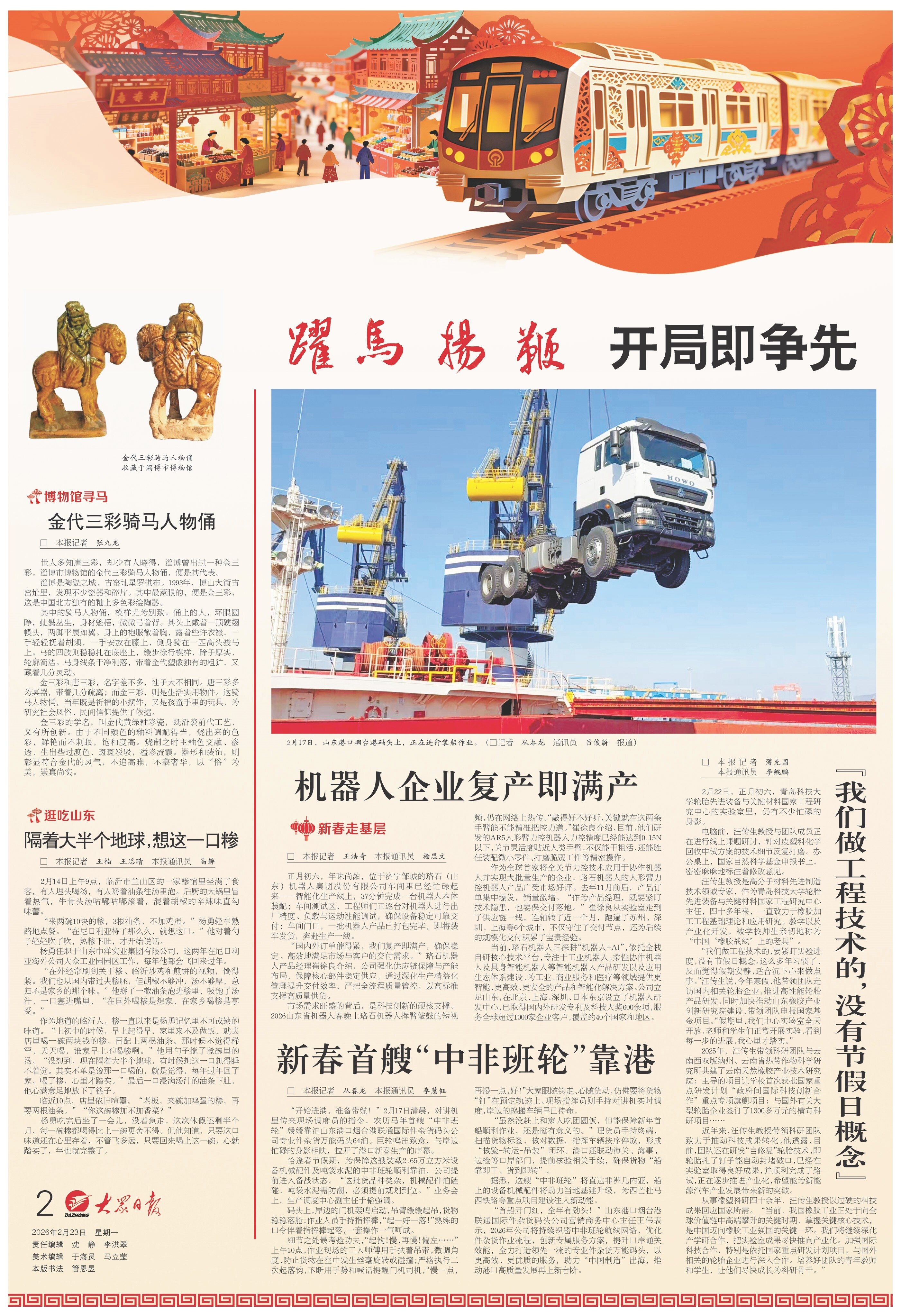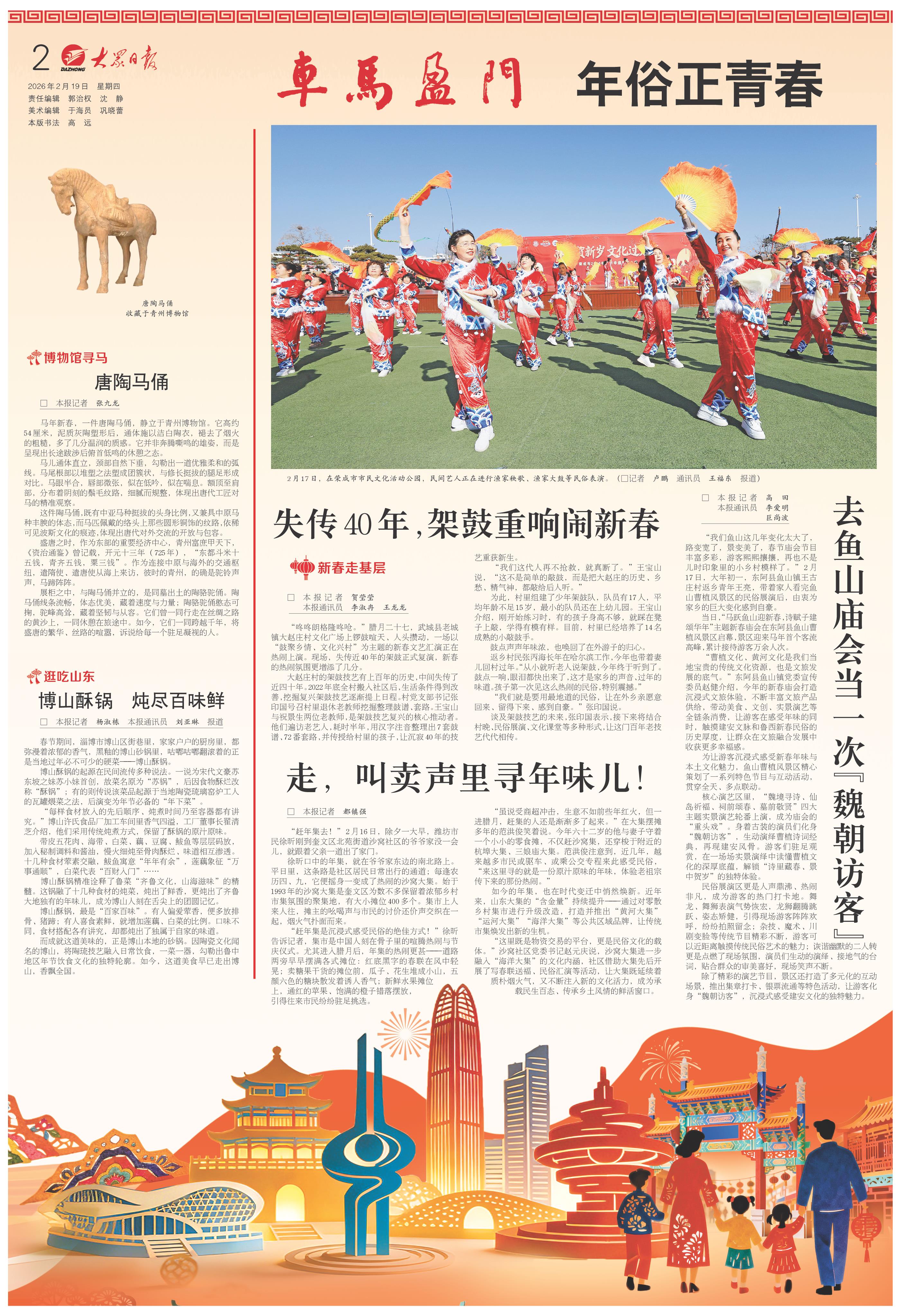 要闻版拼长卷,成语串起齐鲁年。要闻版每天以一个马字成语,融合山东地域特色,徐徐铺展“快马加鞭 情暖回乡路”“金马贺岁 灯火映团圆”“龙马精神 天涯共此时”“车马盈门 年俗正青春”“车水马龙 齐鲁迎客来”“万马奔腾 雅俗同喜乐”“一马当先 奋楫守岁人”“跃马扬鞭 开局即争先”八个专题版面。八个版面连发八日,拼成一幅“热气腾腾中国年 蒸蒸日上新山东”的新春长卷,让读者感受渐次展开的年味图景。