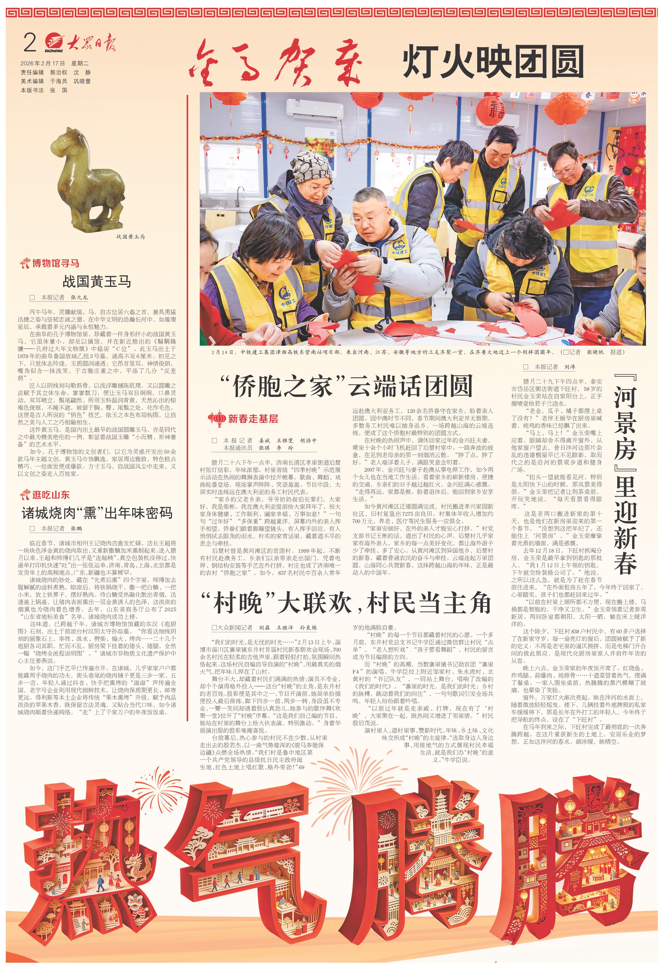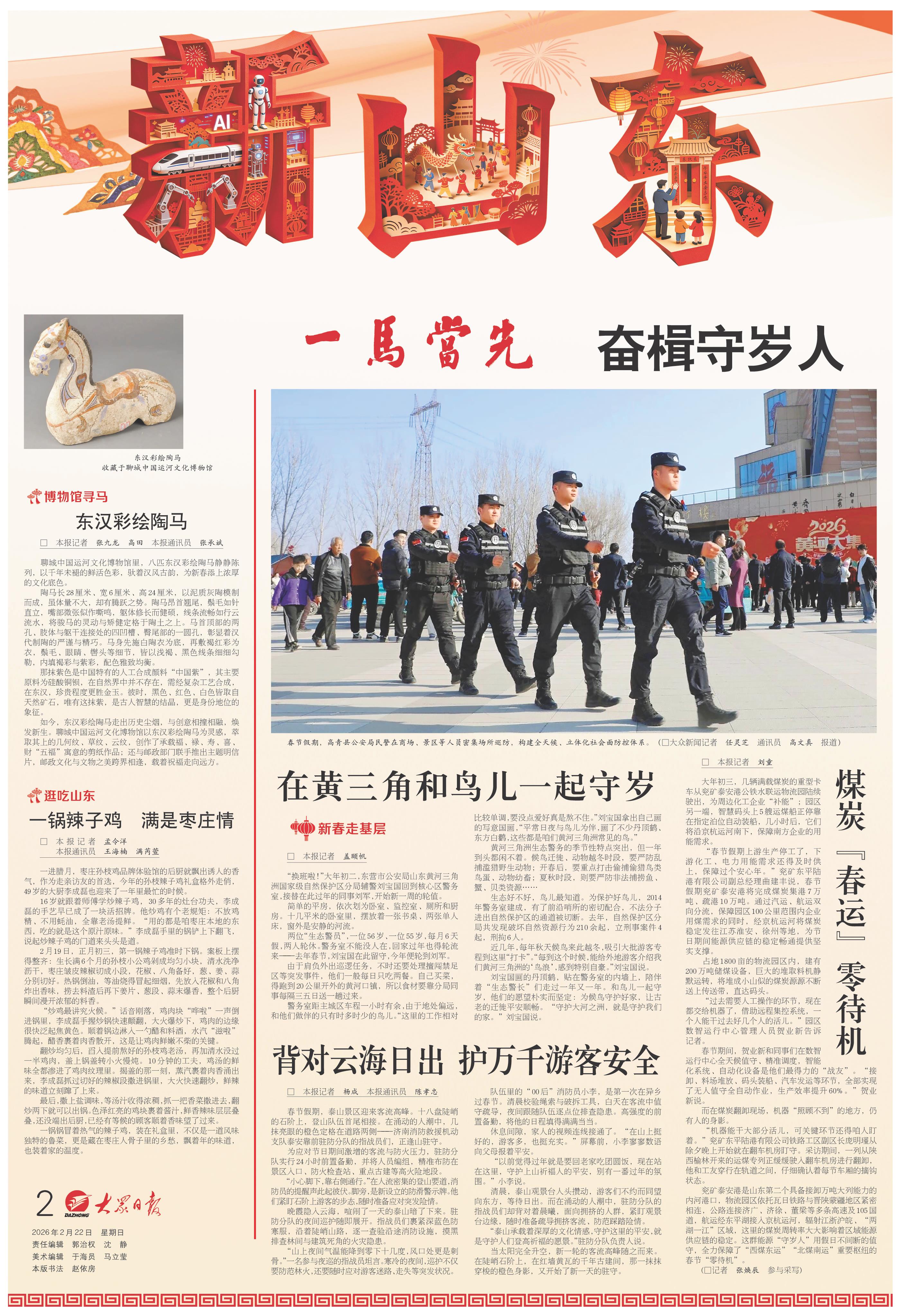 头版强引领,基层故事有温度。头版以“新春走基层”栏目为统领,下设“边疆万里行”“我的家乡又上新”“记者返乡”“齐鲁年味 消费新潮”“假日随笔”“万家灯火”等特色板块。记者深入一线,用脚步丈量民情,以笔触记录变迁,生动呈现山东大地的烟火气息与喜庆祥和的节日氛围。