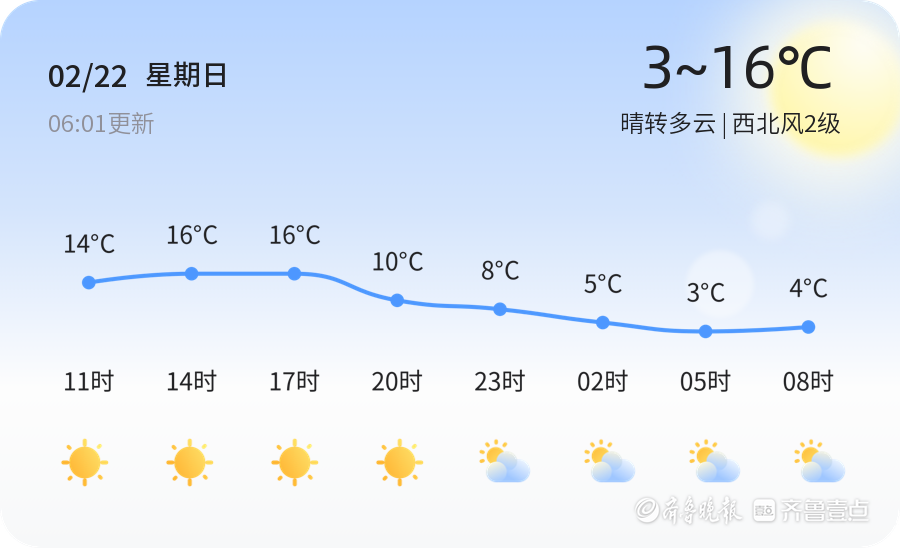 今天是2月22日,农历正月初六,枣庄市天气晴转多云,气温在3℃至16℃之间,西北风2级,空气湿度14%,PM2.5指数149,属于轻度污染。各区天气情况总体平稳,多以晴转多云为主,市民出行需注意防晒和保暖。