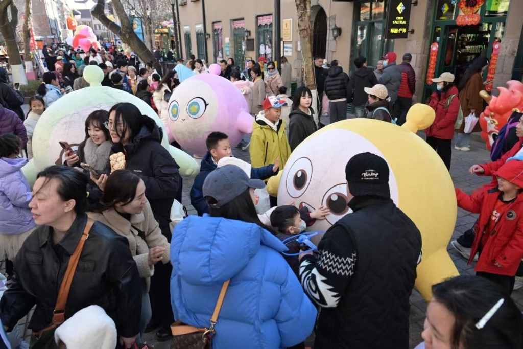从传统神话角色到大鲍岛南区每日多场上演的“大圣巡游”,到潮流IP“蛋仔拜年”“赛博新源·新春送福”穿梭于即墨路街巷,传统与新潮在里院之间完成跨越时空的对话。2月21日(正月初五)“迎财神”主题日,广兴里还举办了“骏鸣新春”歌会,晚间李村路广场“蹦鲍迪”与电子孔明灯放飞点燃了青春活力,让百年戏楼唱响时代新声。