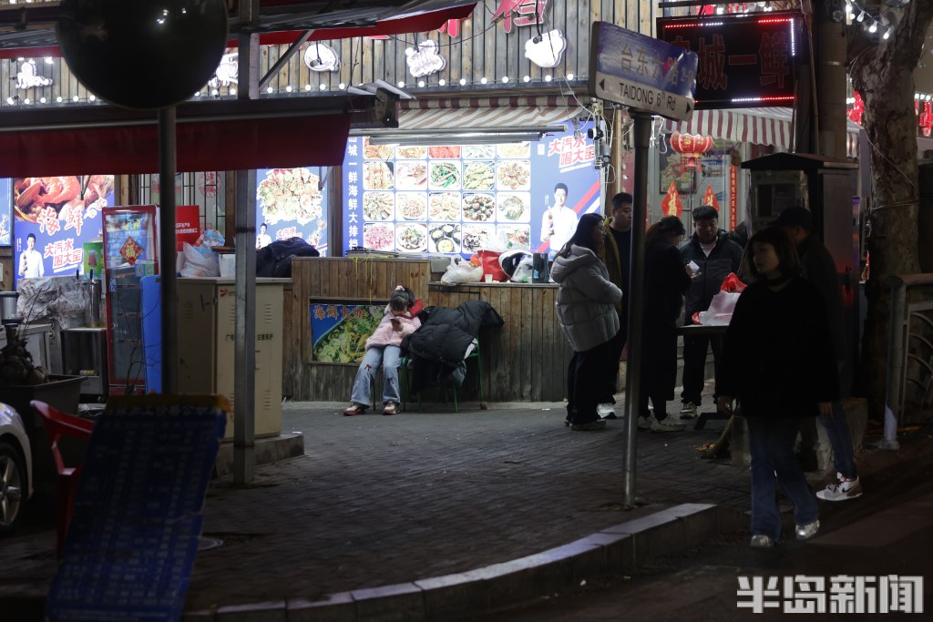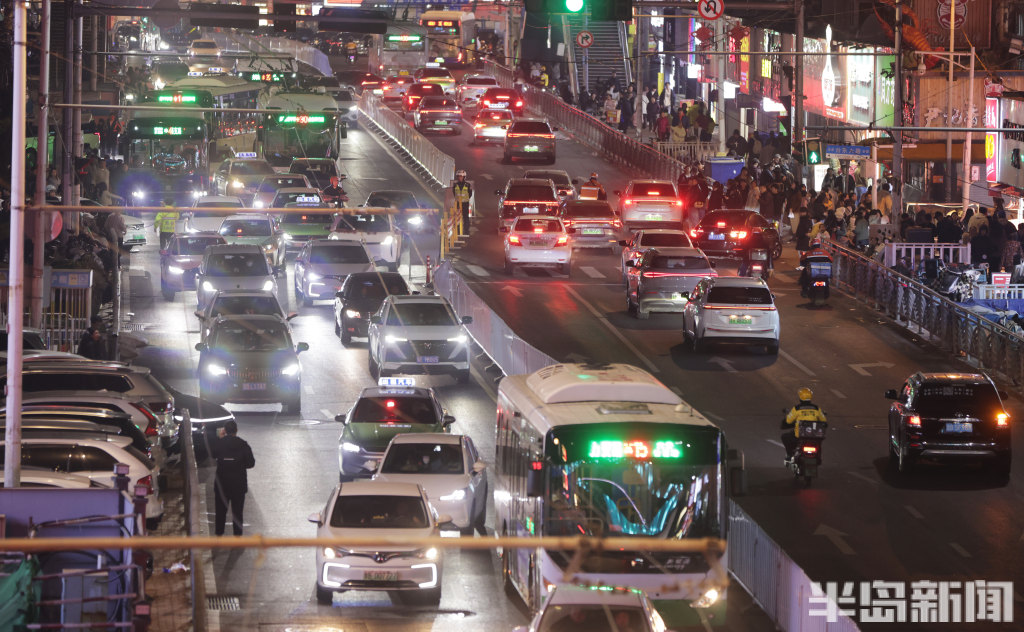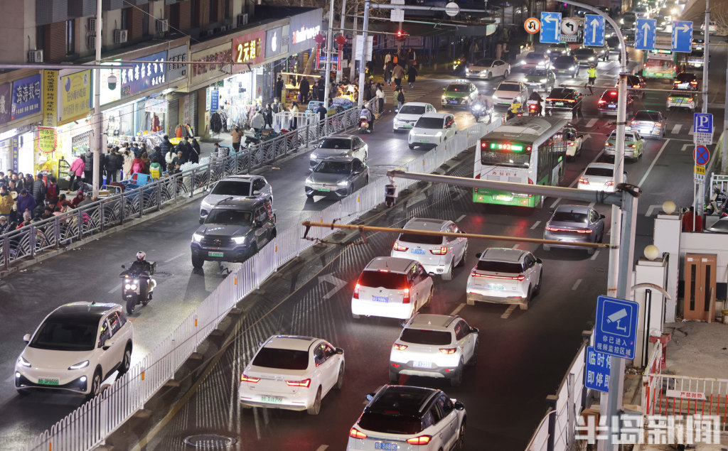2月21日晚,市北区威海路上灯火璀璨、人流如织。由于紧邻台东三路商业街及特色美食街,夜幕降临后,大批市民与游客前来休闲游玩,商圈迎来夜间出行高峰。