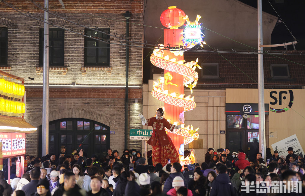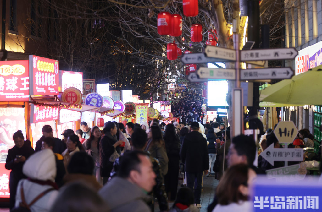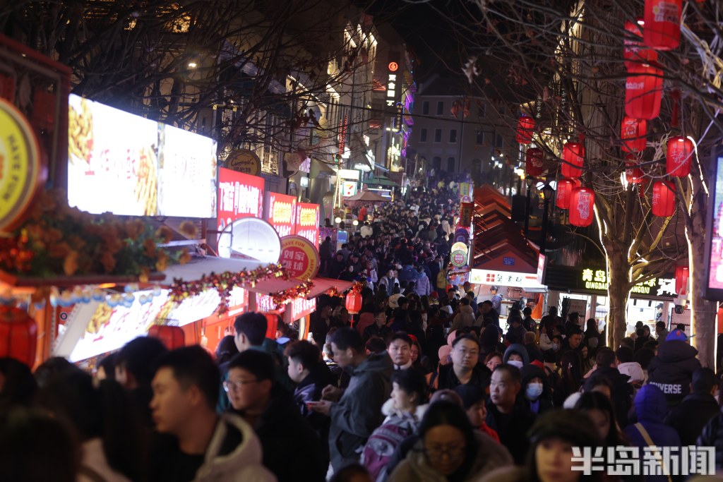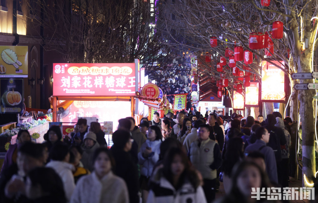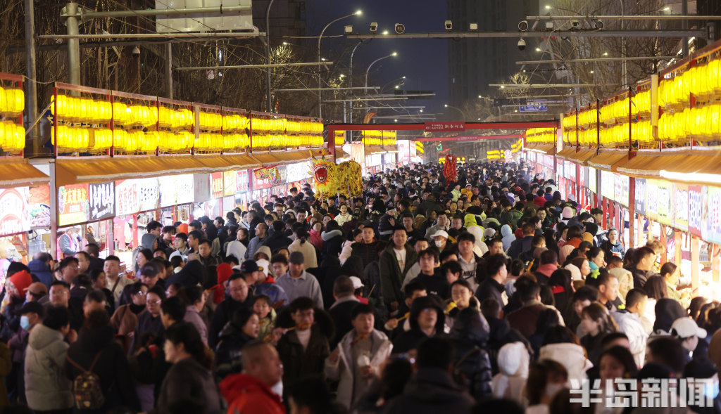 2月21日晚8时许,青岛中山路、胶州路、大鲍岛等景区人头攒动、热闹非凡。赶庙会的市民游客齐聚于此,既能品尝各色特色美食,又能欣赏舞龙、杂耍、戏曲、不倒翁等传统民俗表演。市民们手持糖球、鱿鱼,不少小朋友骑在家长肩头,沉浸在喜庆热闹的氛围中。