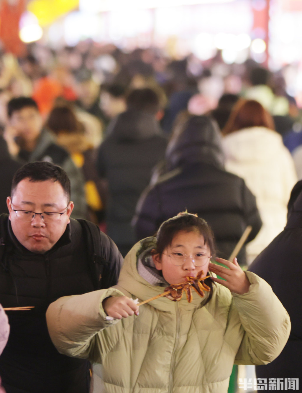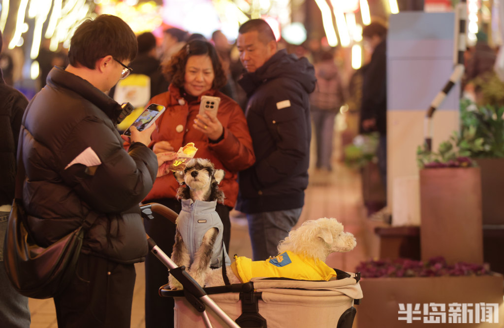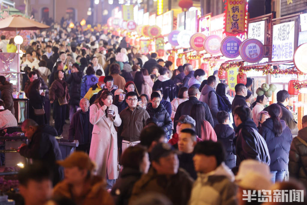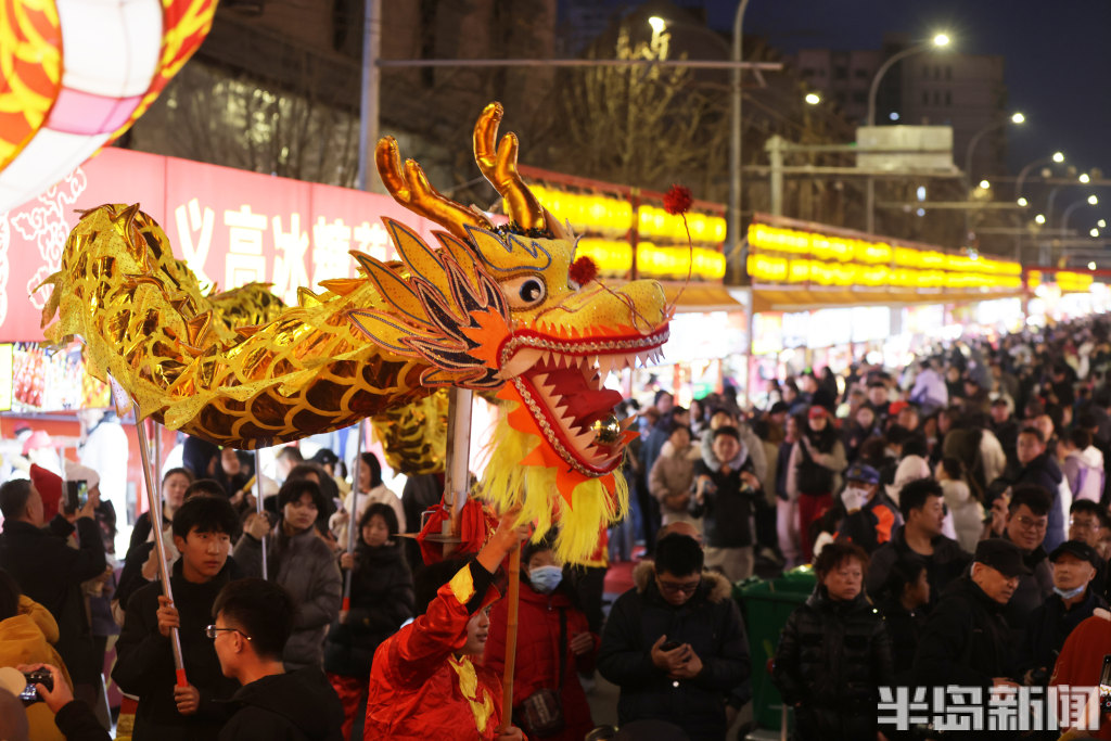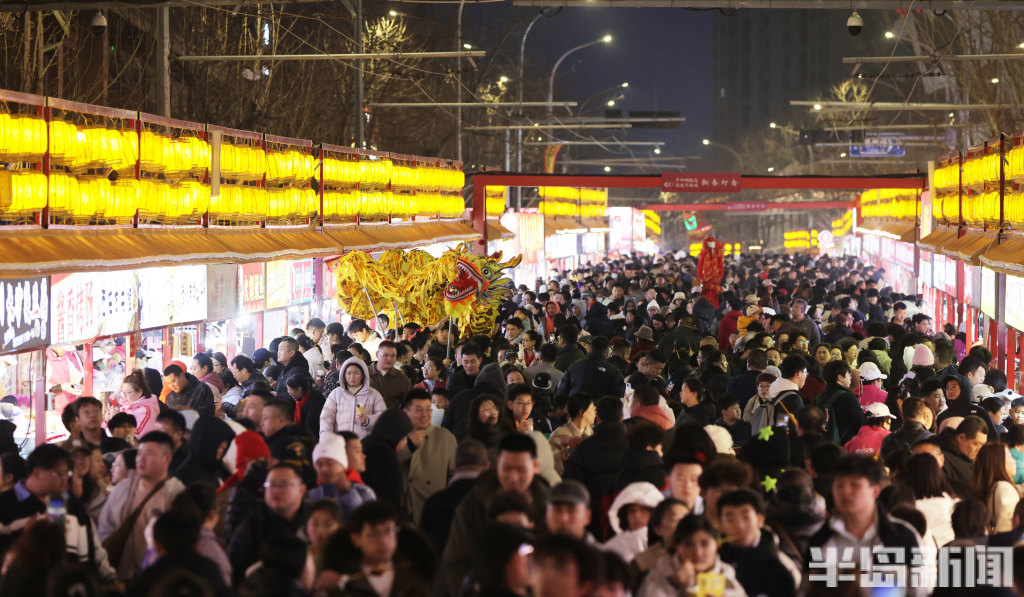 2月21日晚8时许,青岛中山路、胶州路、大鲍岛等景区人头攒动、热闹非凡。赶庙会的市民游客齐聚于此,既能品尝各色特色美食,又能欣赏舞龙、杂耍、戏曲、不倒翁等传统民俗表演。市民们手持糖球、鱿鱼,不少小朋友骑在家长肩头,沉浸在喜庆热闹的氛围中。