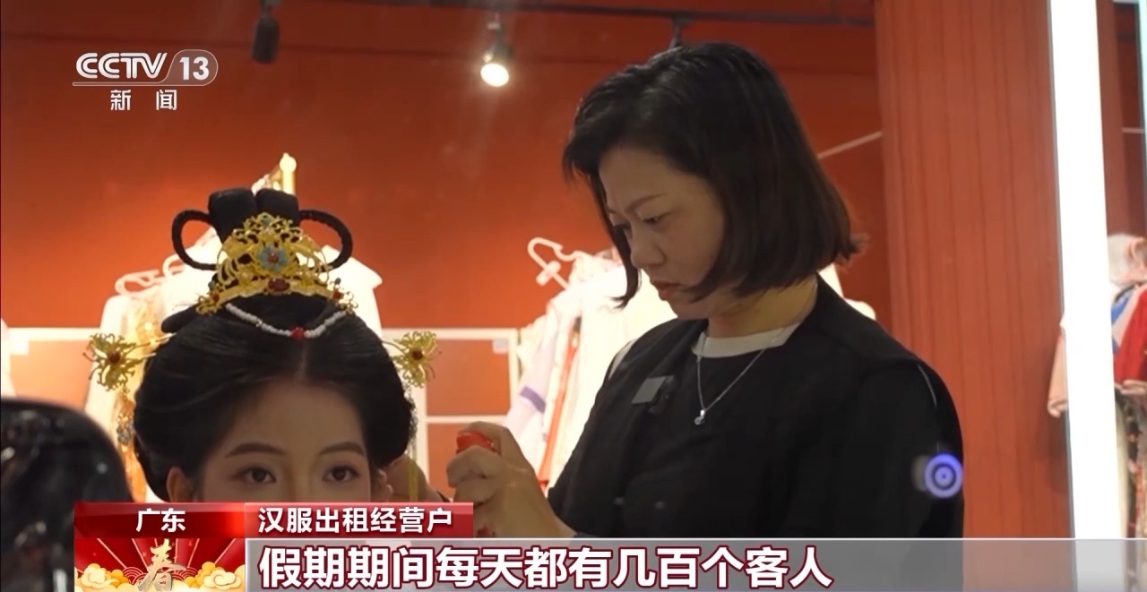 汉服出租经营户:假期期间每天都有几百个客人过来化妆,特别是年轻的女孩子。穿上古代的服装就好像穿越了,还能偶遇到剧组当个群演,挺开心的。
