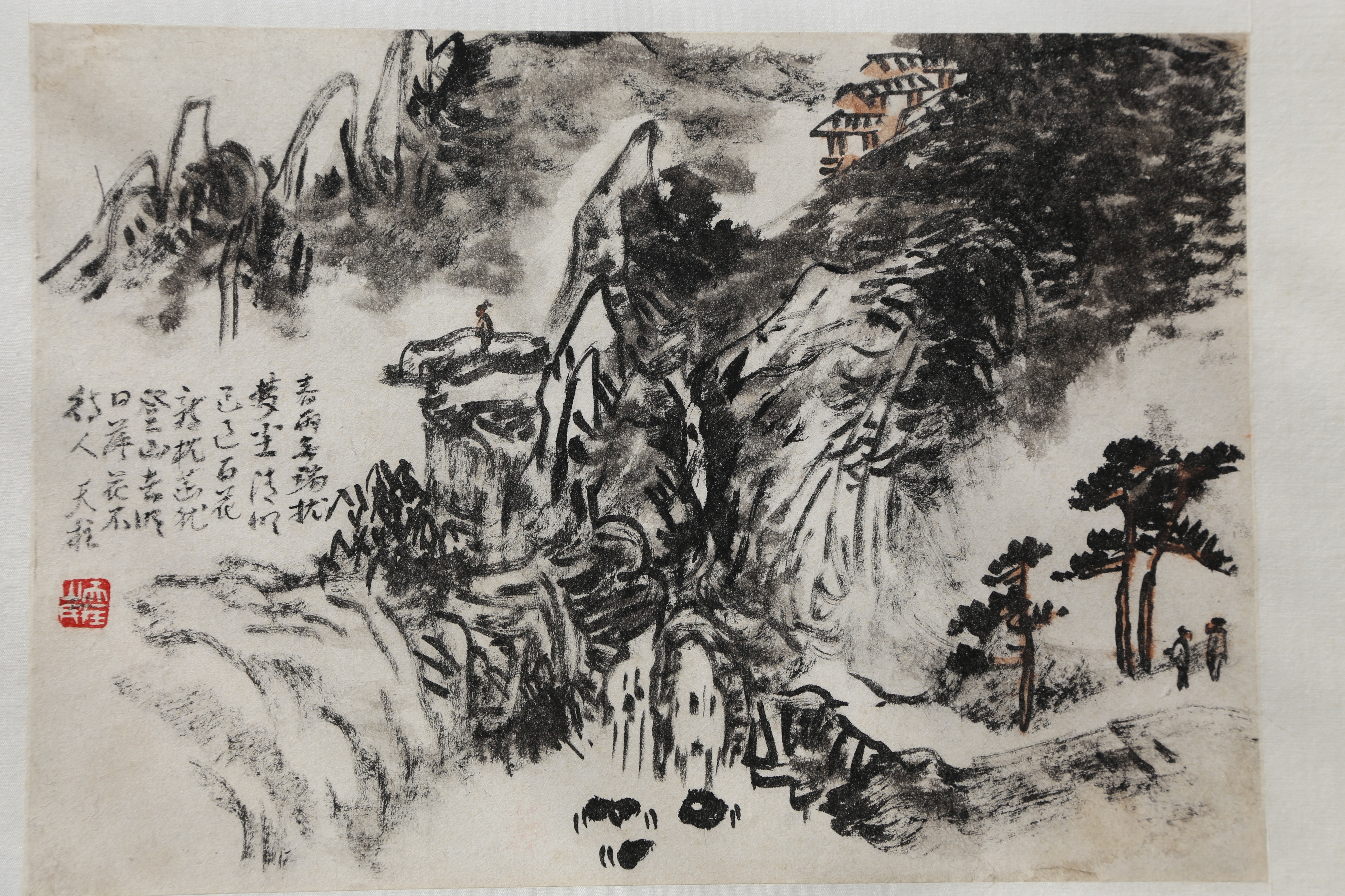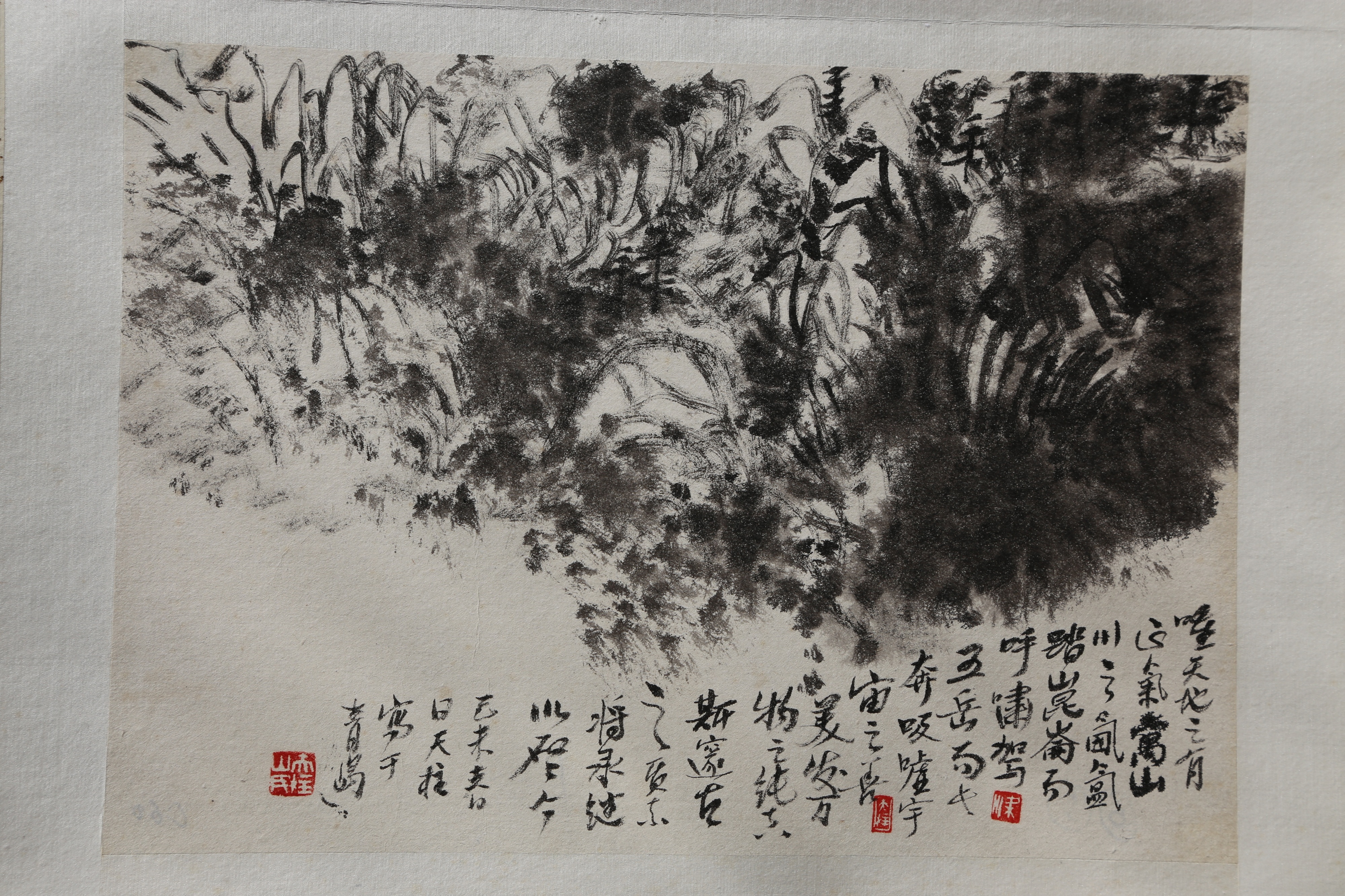 他有两大传奇,一是有空闲就在处方笺上练绝活,每天至少要画几十张。二是曾在一处14平方米的小阁楼居住作画一二十年,大至数十米的巨幛,小至半尺的册页,从不打稿,也不愿画重复的画,提笔就上,直接以焦墨画墨稿,不修不补,一笔贯底,一气呵成。