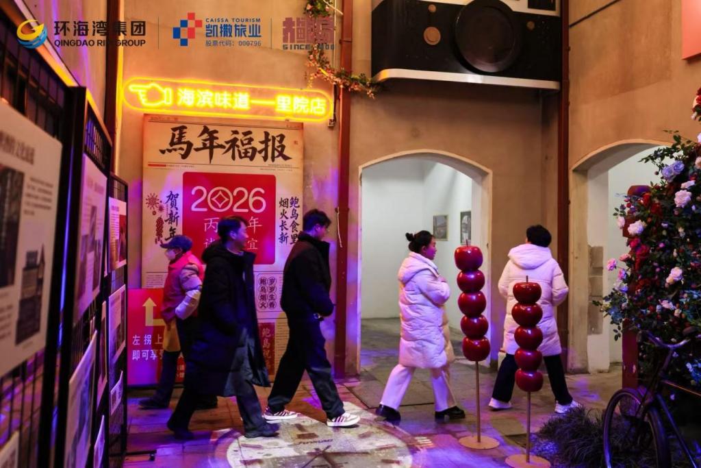 这种“接力”在晚7点到9点达到高潮。记者跟随一个三代同堂的家庭体验了这条动线:爷爷奶奶先在北区永春里的“商贸院落”前拍了一组花灯合影,顺路在即墨路的“鲍岛食里”买了“劈柴院”锅贴当夜宵;年轻的父母带着孩子挤在“哪吒”灯组前拍了五分钟短视频;随后一家人“顺路”拐进南区,孩子在高密路28号的“YOUNG 空间”体验 XR《太空奥德赛》,爷爷奶奶则在一层的文创区翻着青岛出版集团的联名产品歇脚。