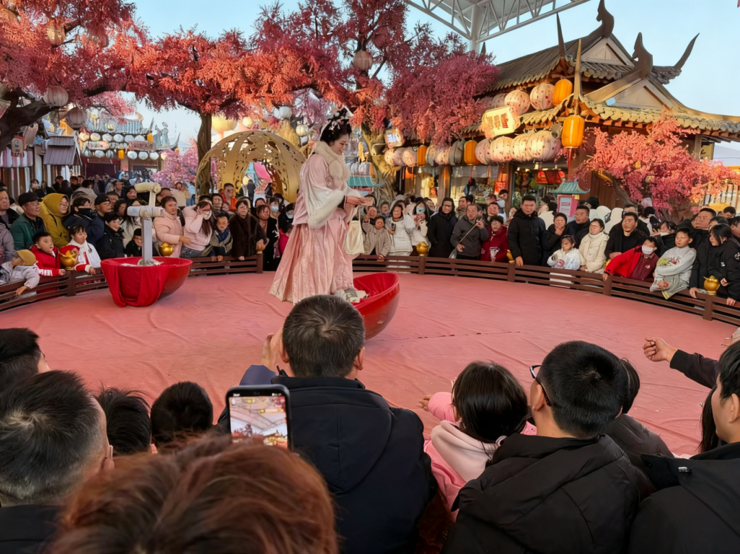 吴桥杂技、药发木偶、河南豫剧等200场演艺节目每天轮番上演,NPC(角色扮演)巡游也吸引了众多游客参与互动。据了解,大年初一当天,梦幻桃花源景区单日客流量突破了12万人次。