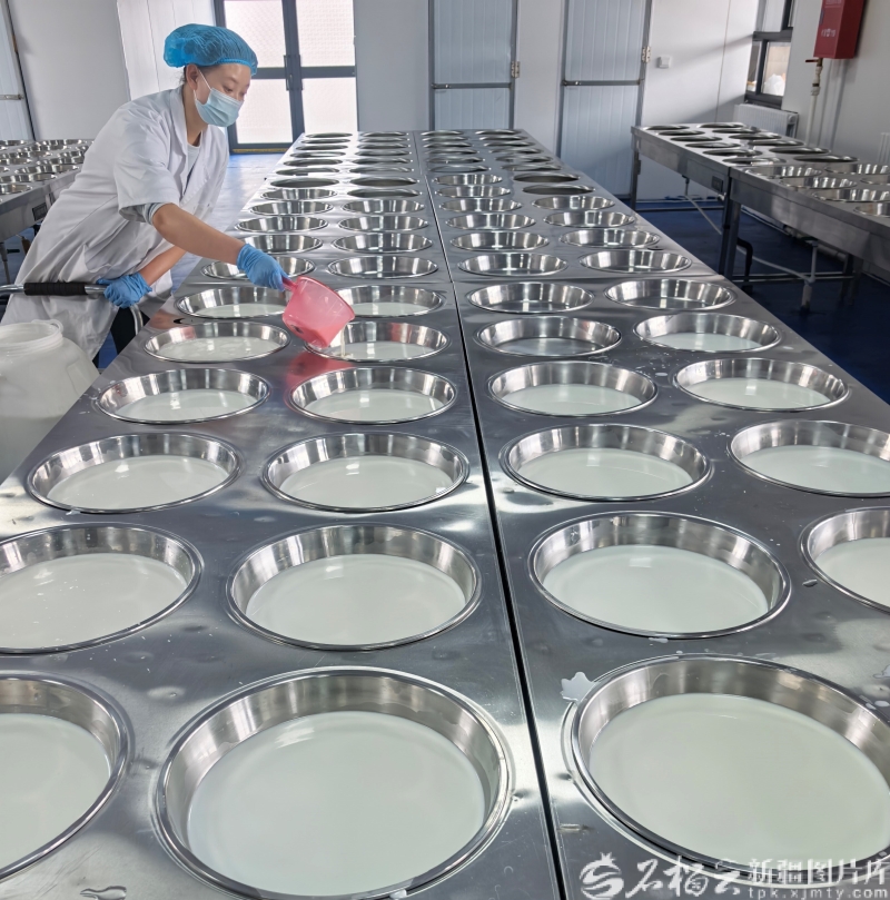 2月20日,在奇台县香可儿食品加工厂,工人在加工纯手工酸奶。孟媛摄