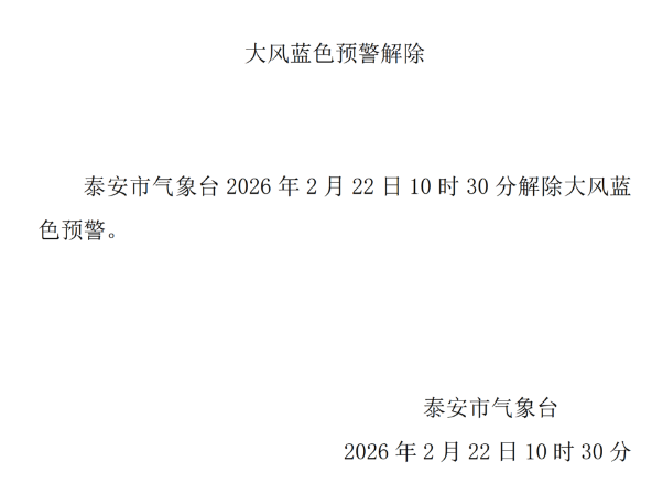 2月22日10时30分,泰安市气象台解除大风蓝色预警、大风蓝色预警信号。详情如下↓↓↓