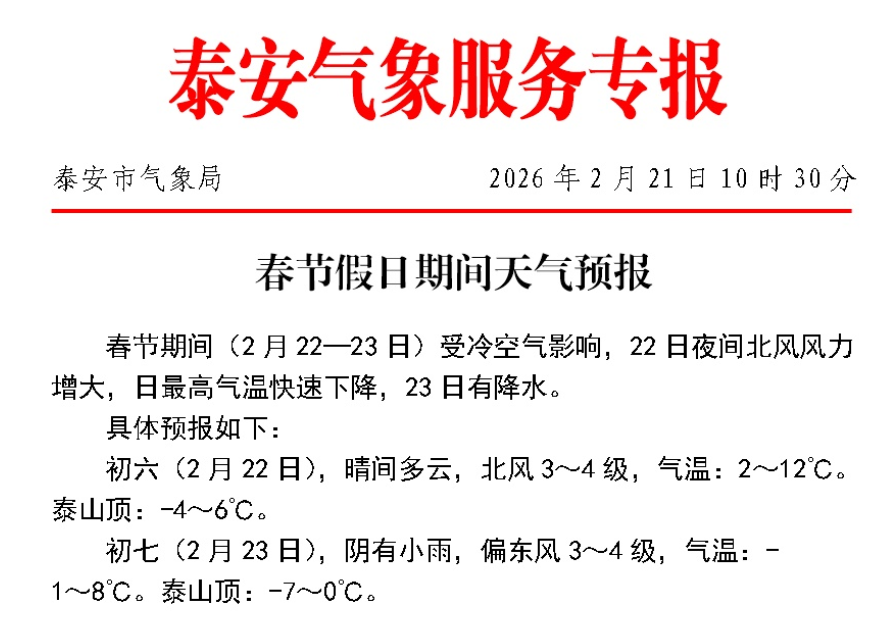 初六(2月22日),晴间多云,北风3~4级,气温:2~12°C。泰山顶:-4~6°C。