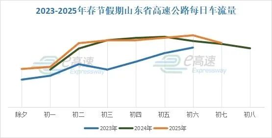 2023年至2025年春节期间,每日车流量数据显示,假期结束前次日(2月22日,正月初六),达到春节假期流量峰值,形成集中返程高峰。