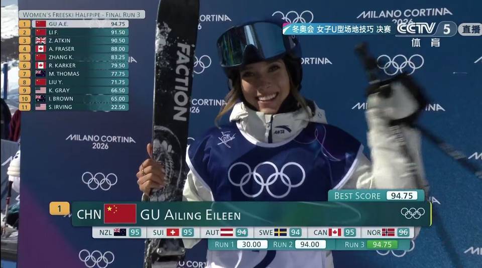 北京时间2月22日晚,米兰冬奥会迎来最后一个比赛日,自由式滑雪女子U型场地技巧决赛,卫冕冠军谷爱凌凭借第3轮94.75分的成绩,夺得金牌!这是中国代表团本届冬奥会的第五枚金牌。