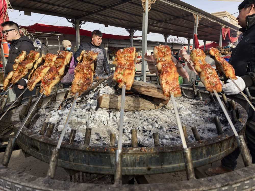 这是2月15日在喀什牛羊大巴扎上拍摄的售卖中的烤鱼。新华社记者 蔡国栋 摄