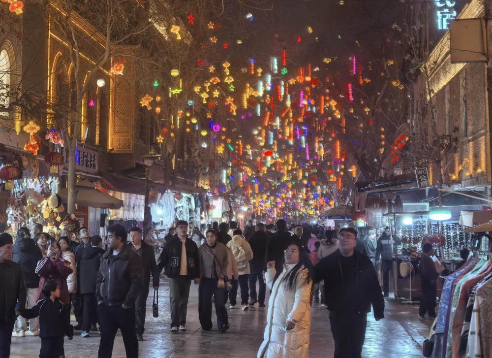 春节期间,喀什古城相继举办社火巡游、英歌舞表演、篝火晚会等特色展演活动,吸引众多游客参与体验。“我们想把新春的祝福传递给在场的每一个人。”演员奥斯曼·克热木说,“借着这份热闹,祝愿大家新的一年顺顺利利、红红火火,也希望让更多人看到我们传统民俗的魅力。”