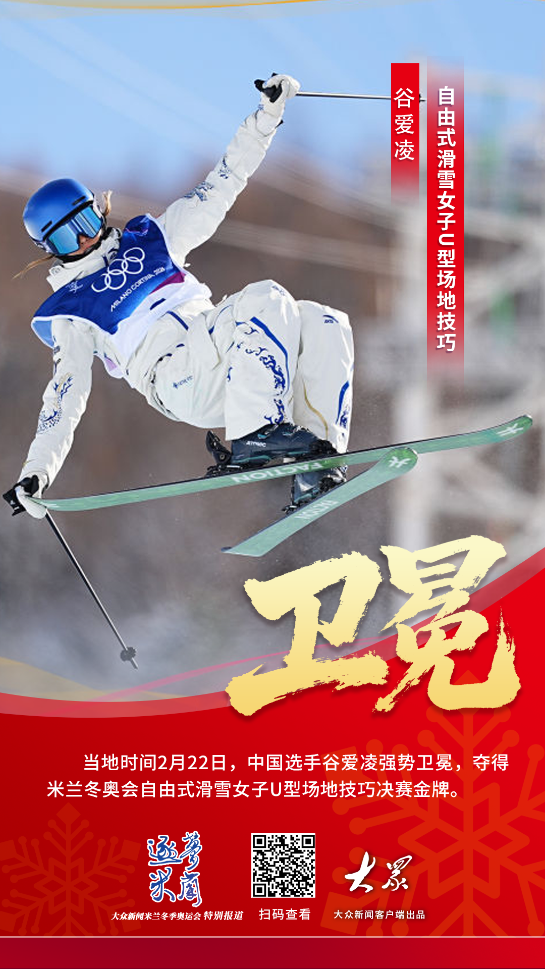 谷爱凌,冬奥卫冕!大众新闻 于晓波 李伟 张怀博 2026-02-22 22:30:16原创当地时间2月22日,中国选手谷爱凌强势卫冕,夺得米兰冬奥会自由式滑雪女子U型场地技巧决赛金牌。(大众新闻记者 于晓波 李伟 设计 张怀博)责任编辑:叶彤