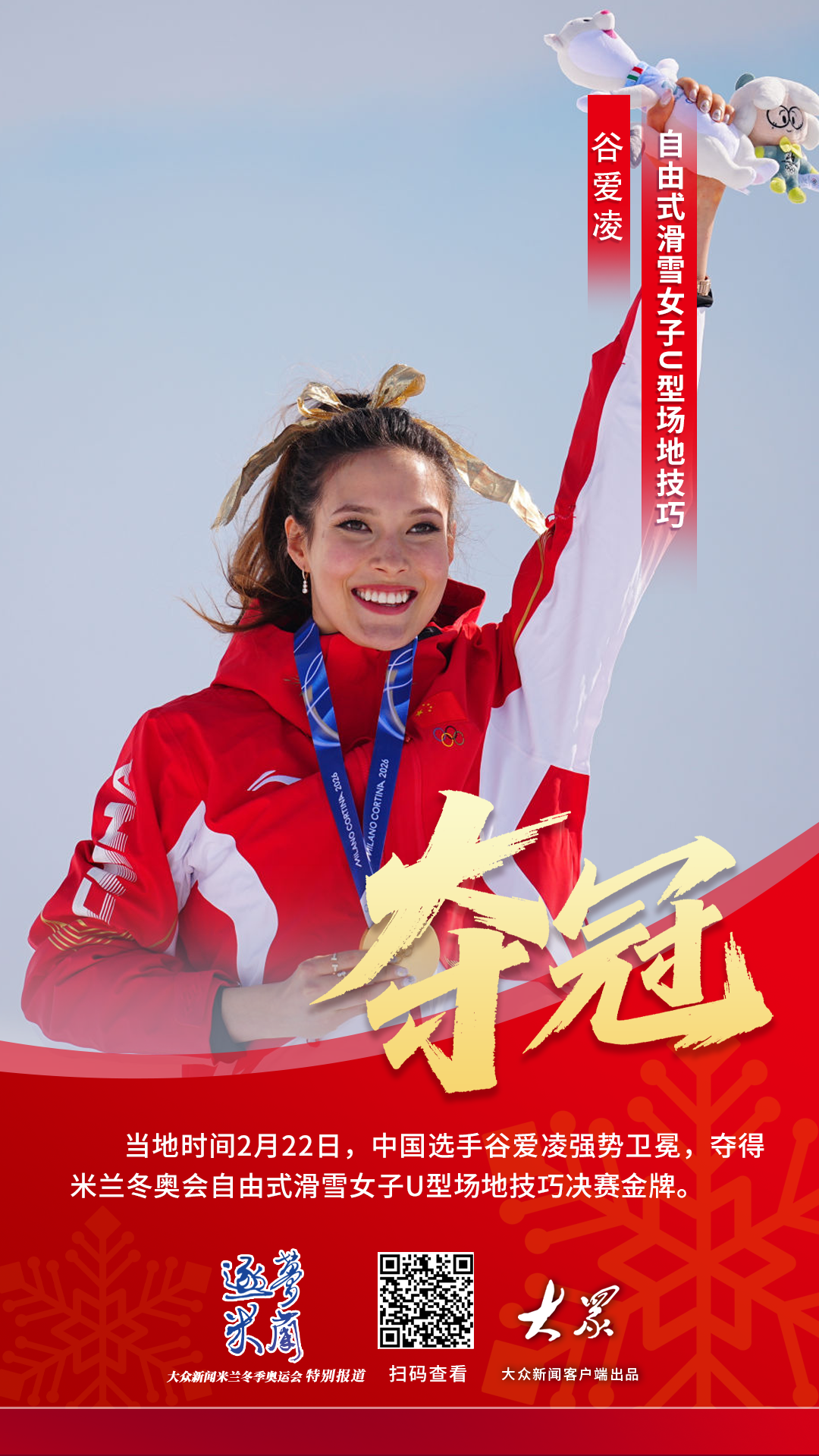 当地时间2月22日,中国选手谷爱凌强势卫冕,夺得米兰冬奥会自由式滑雪女子U型场地技巧决赛金牌。(大众新闻记者于晓波李伟设计张怀博)