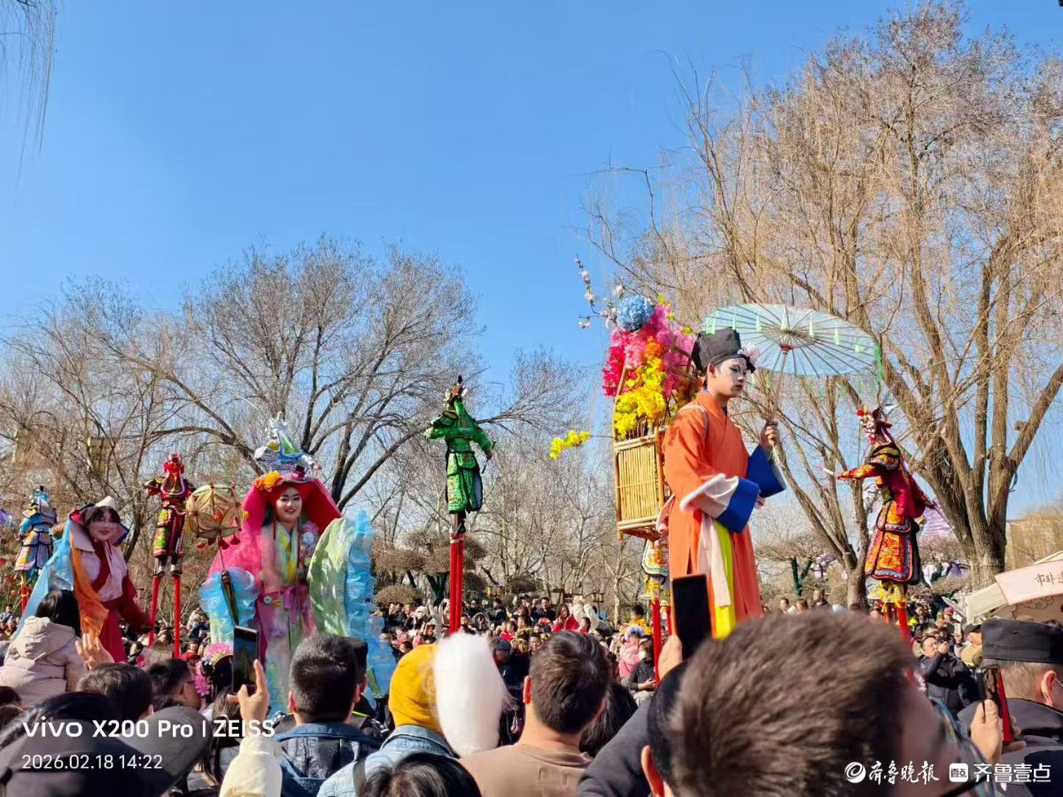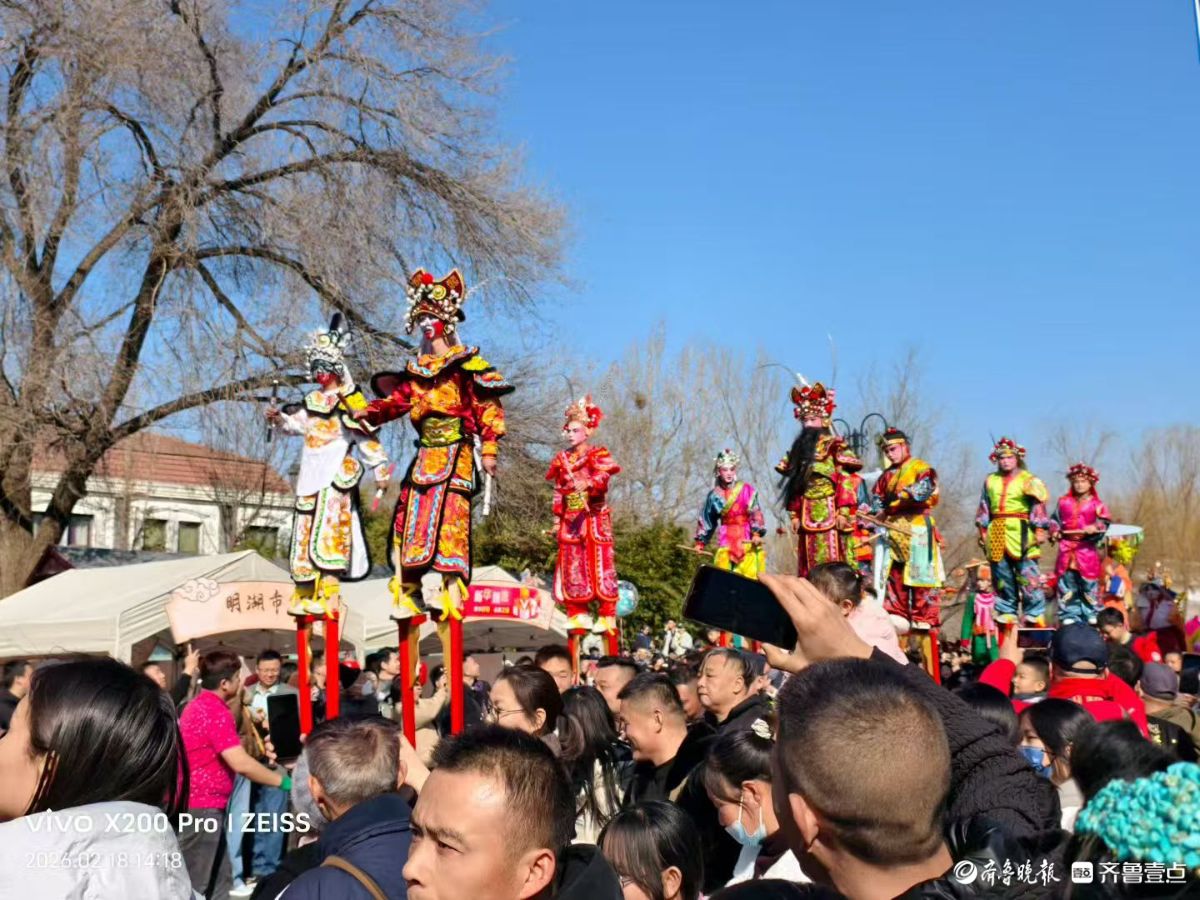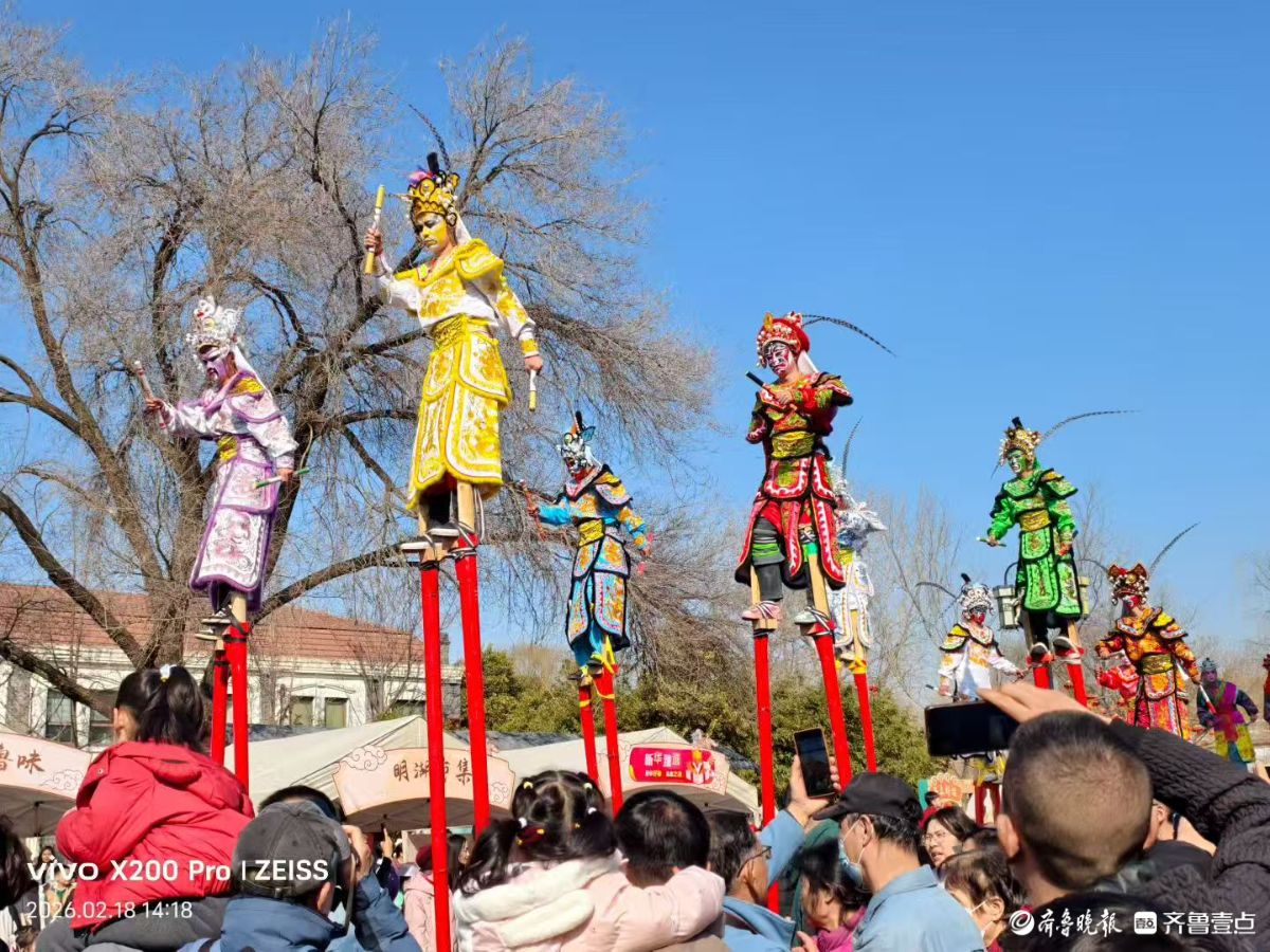 大年初二,明湖集市上的高跷巡游