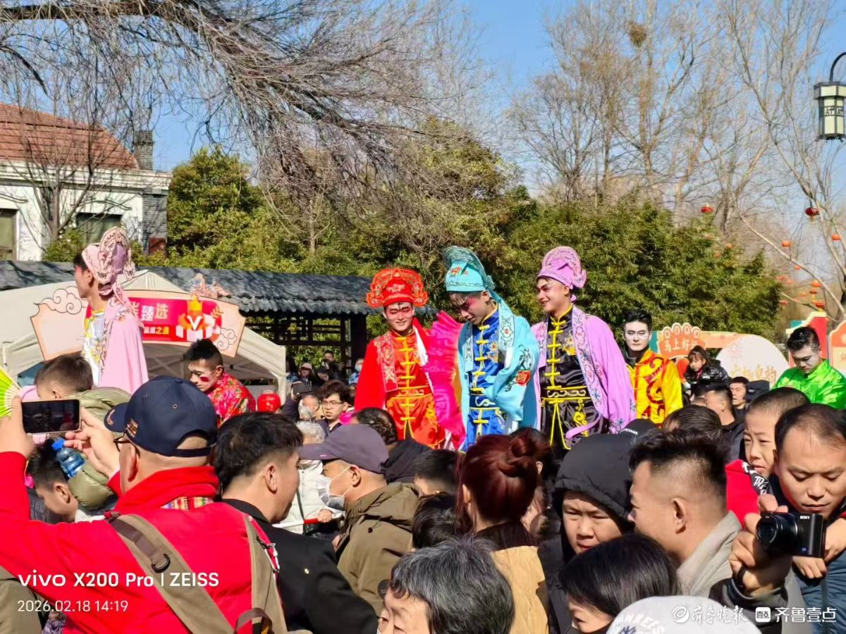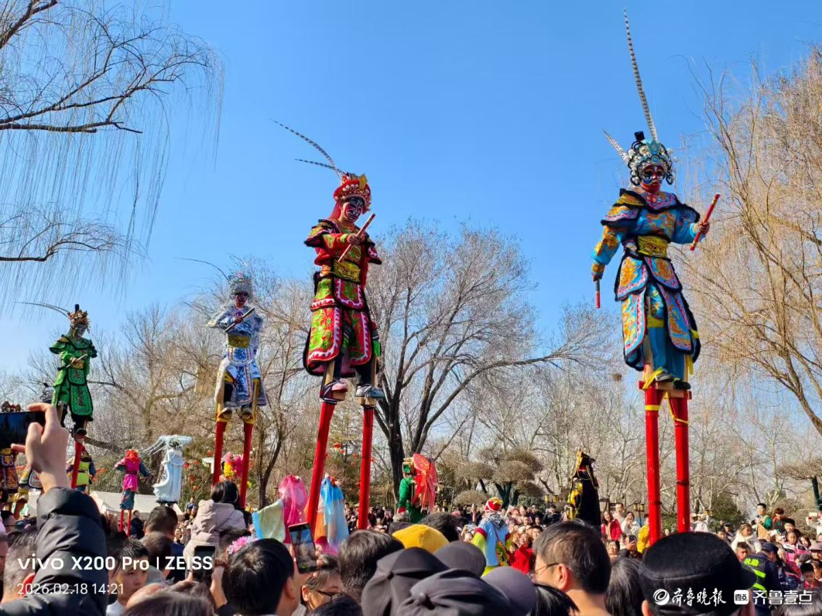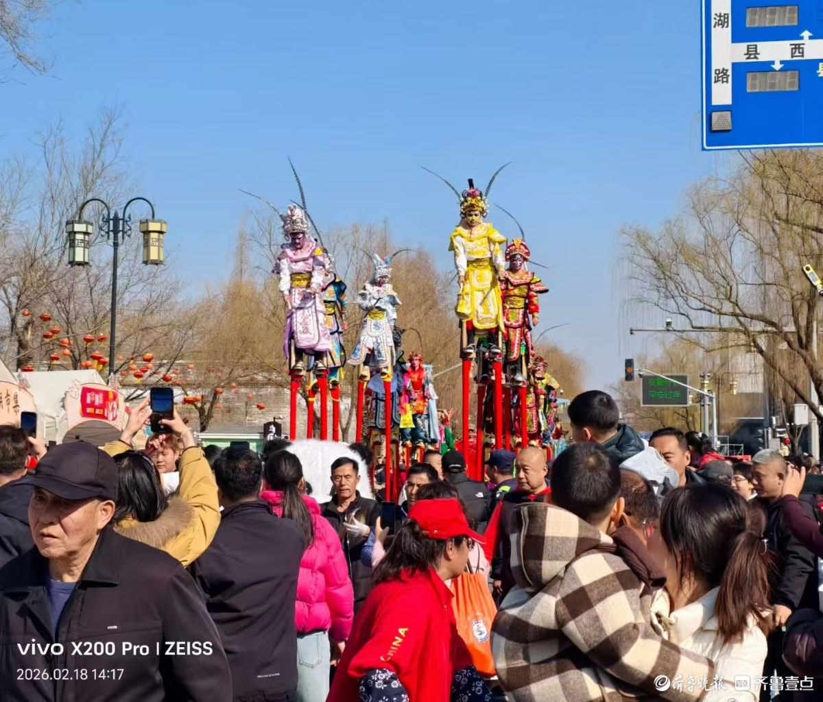 大年初二,明湖集市上的高跷巡游