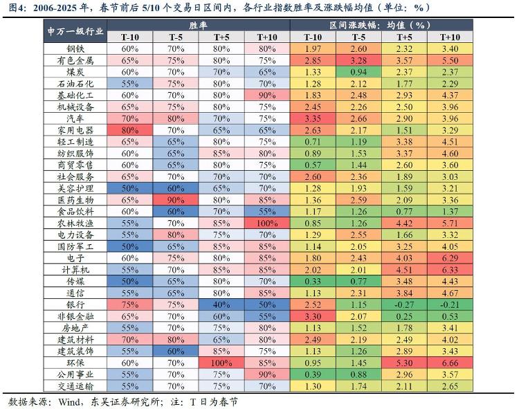 东吴证券复盘了近20年A股春节前后的市场表现,指出节前一周是指数布局的最佳窗口期,节前5日左右往往迎来反弹拐点。行业方面,节前历史表现占优的行业主要包括有色、汽车、化工、医药、电力设备等,节后表现相对突出的是环保、电子、传媒、农林牧渔等。