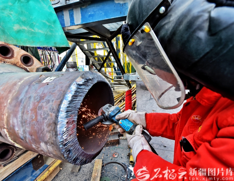 2月19日,独山子石化塔里木大化肥搬迁装置改造项目施工现场,工人在焊接设备。