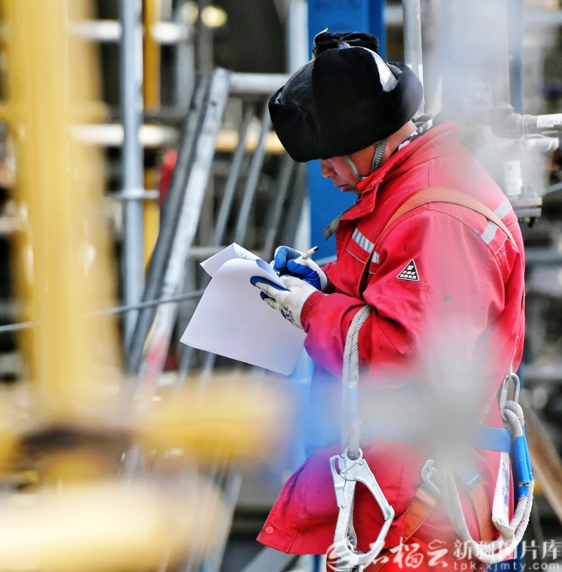 2月19日,独山子石化塔里木120万吨乙烯2期项目施工现场,工人在抄录设备安装数据。