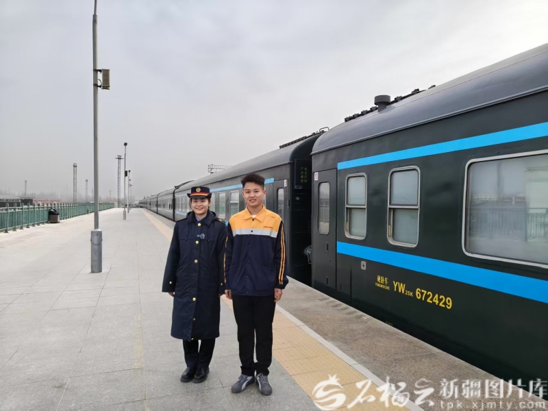 工作间隙,龙宏霄和王娇在库车站站台上合影。石榴云/新疆日报记者 张治立摄