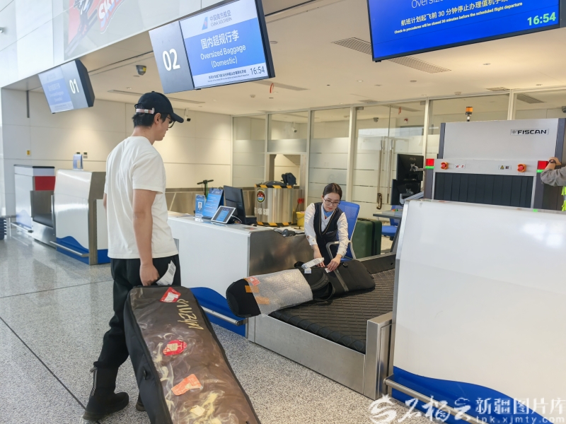 随着新疆冰雪旅游持续升温,春运与春节假期叠加,乌鲁木齐天山国际机场里随处可见带着雪板、雪服、雪鞋的旅客,大件行李托运成了最忙碌的事项之一。