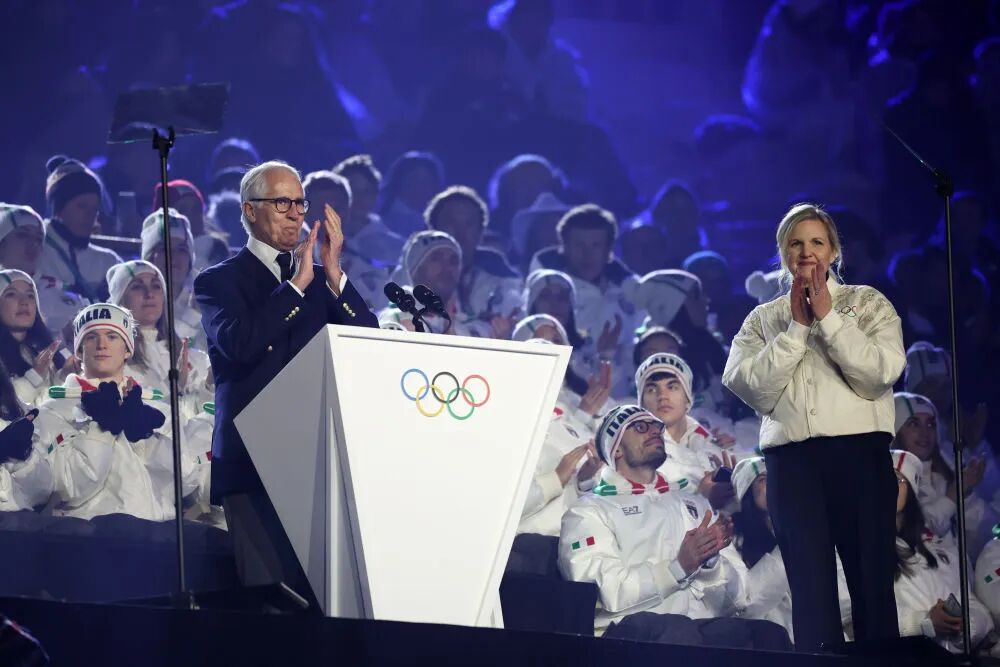国际奥委会主席考文垂和米兰-科尔蒂纳丹佩佐冬奥会组委会主席乔瓦尼·马拉戈在闭幕式上。